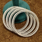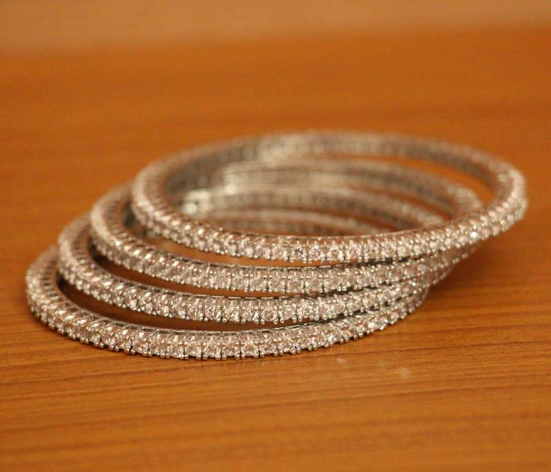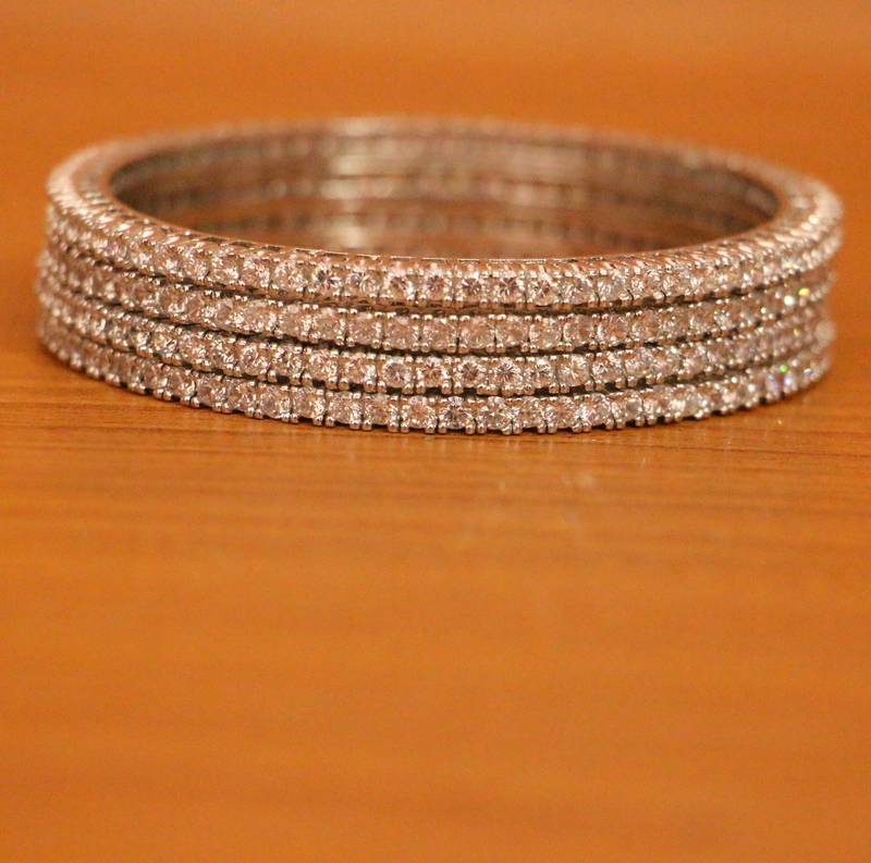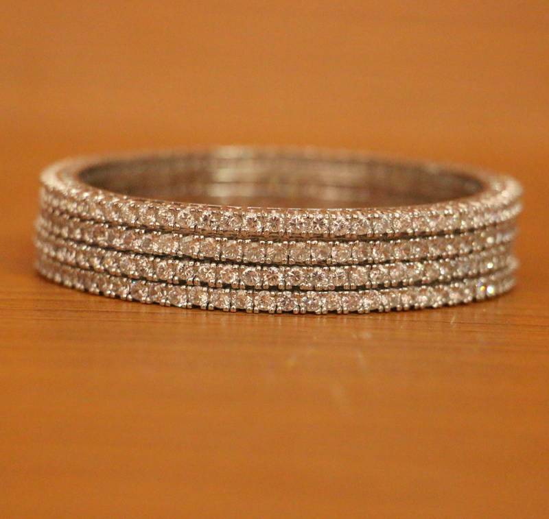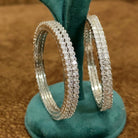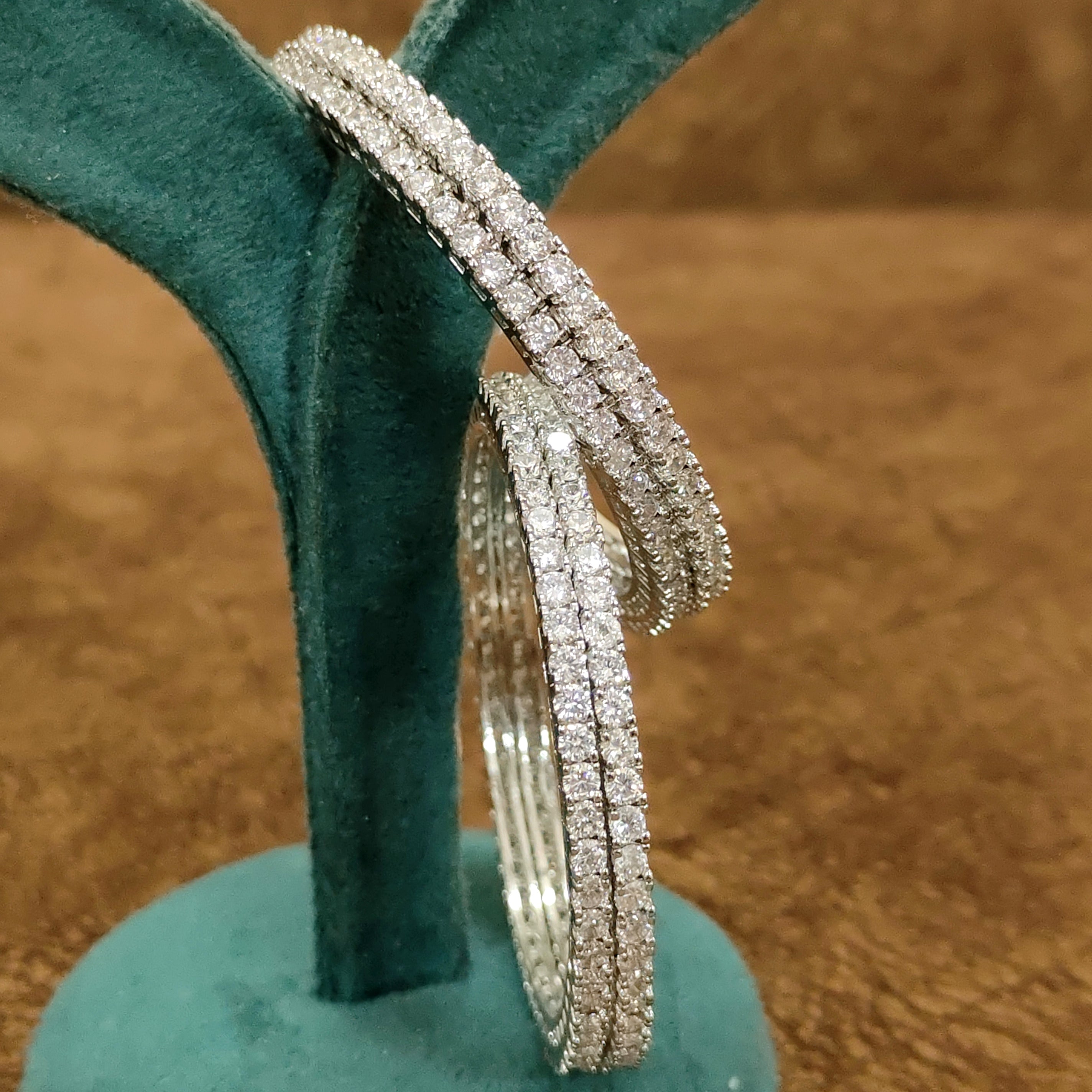 Shine with timeless elegance wearing our Eternal Sparkle Silver Finish CZ Stone Bangles, exclusively by Sanvi Jewels. These bangles are crafted with a premium rhodium-plated silver finish and studded with multiple rows of high-quality cubic zirconia stones, giving them a real diamond-like brilliance.