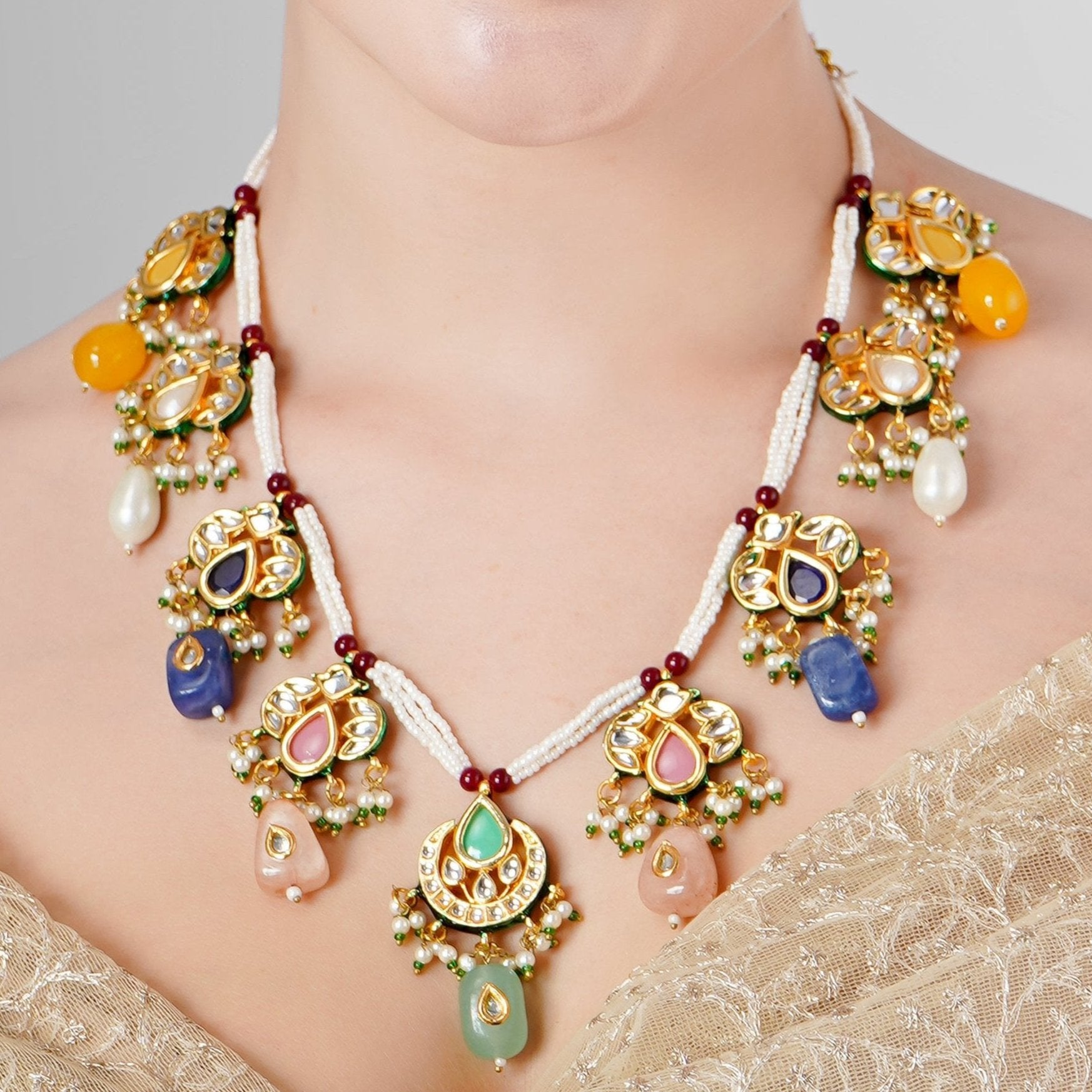Elevate your style with our multicolour kundan polki necklace set ! Adorned with red and green stones, kundan polki stones, and meenakari work, this set is an 18kt gold plated treasure. The perfect matching earrings complete the unique look, perfect for weddings, parties, and special occasions. Embrace the trend and make your day even more special!
