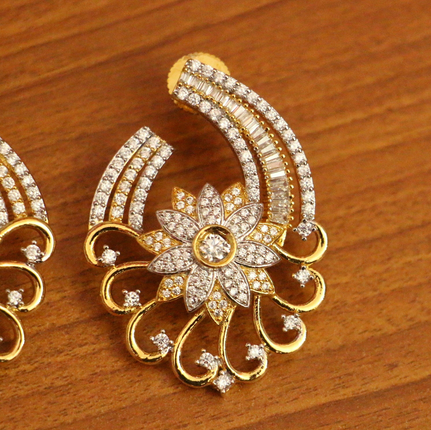 These earrings are handcrafted in silver alloy with imitation american diamond work of very fine quality. These artistic yet modern earrings are plated with high quality gold rhodium. The earrings are very light in weight.
