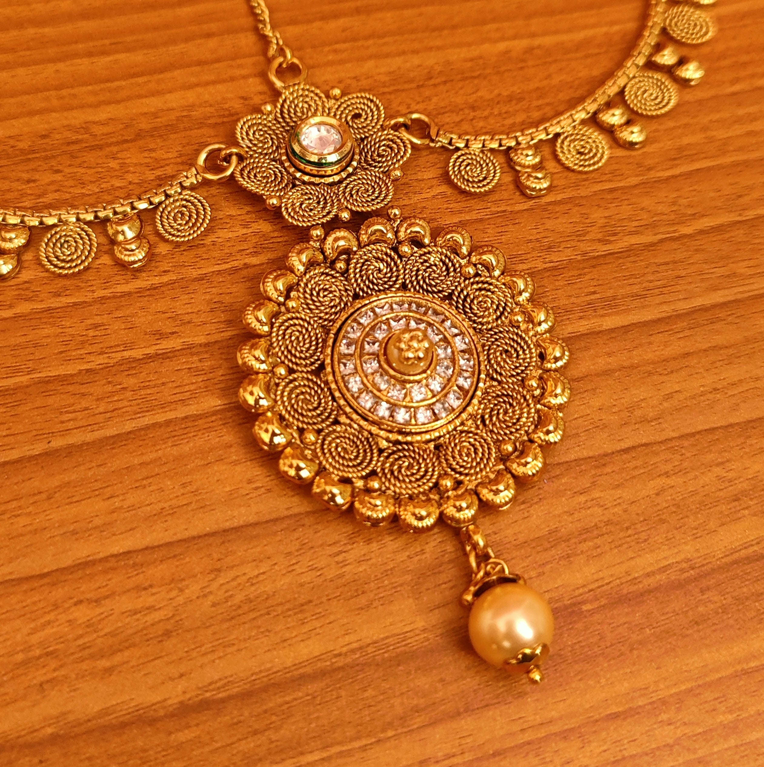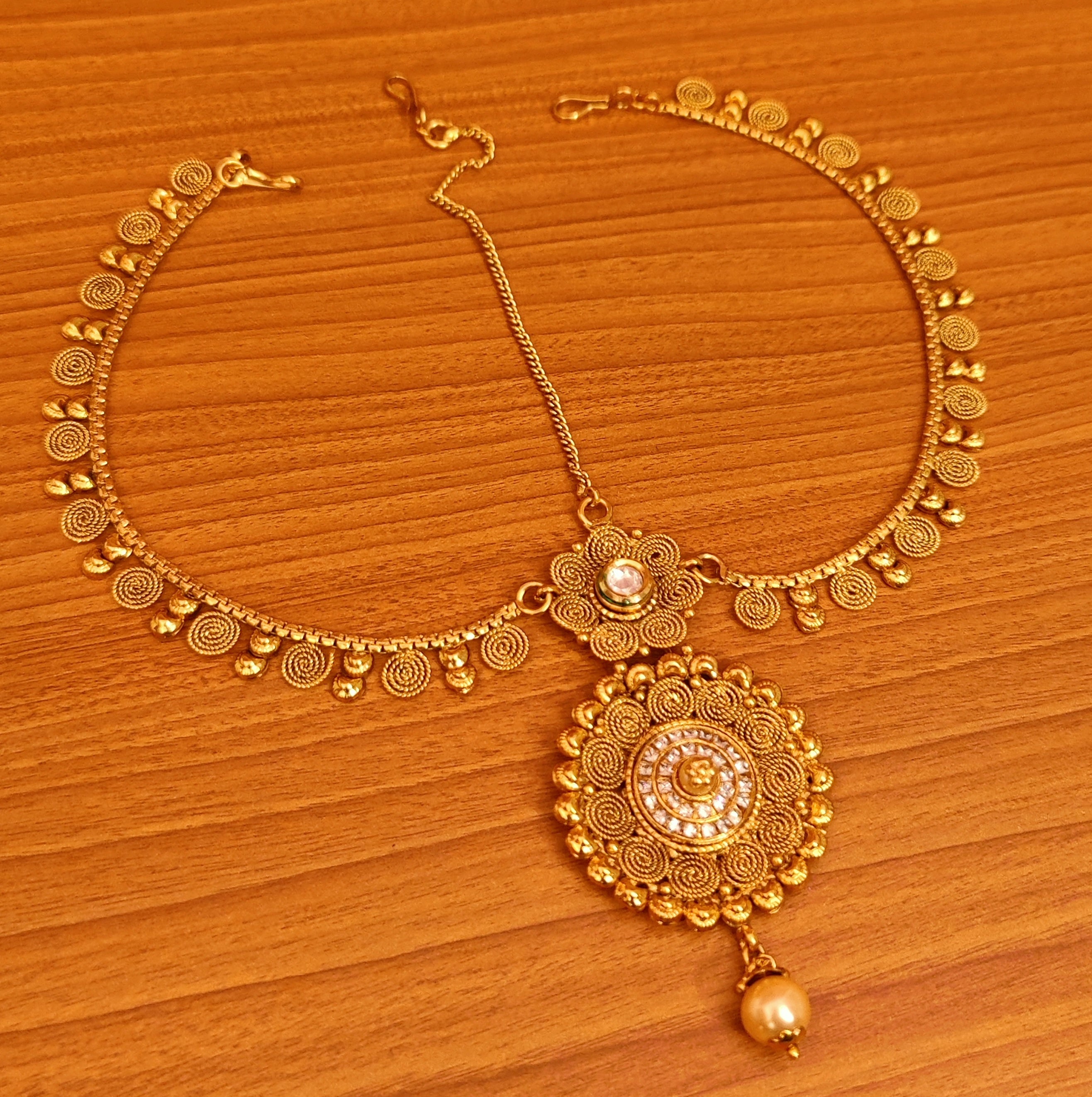 This kundan polki mathapatti is handcrafted in copper alloy with imitation zircon & gold polki work of very fine quality . this maang tikka is coated with 18 kt gold polish which give them a unique look . an absolutely stunning piece to own and are very light in weight.