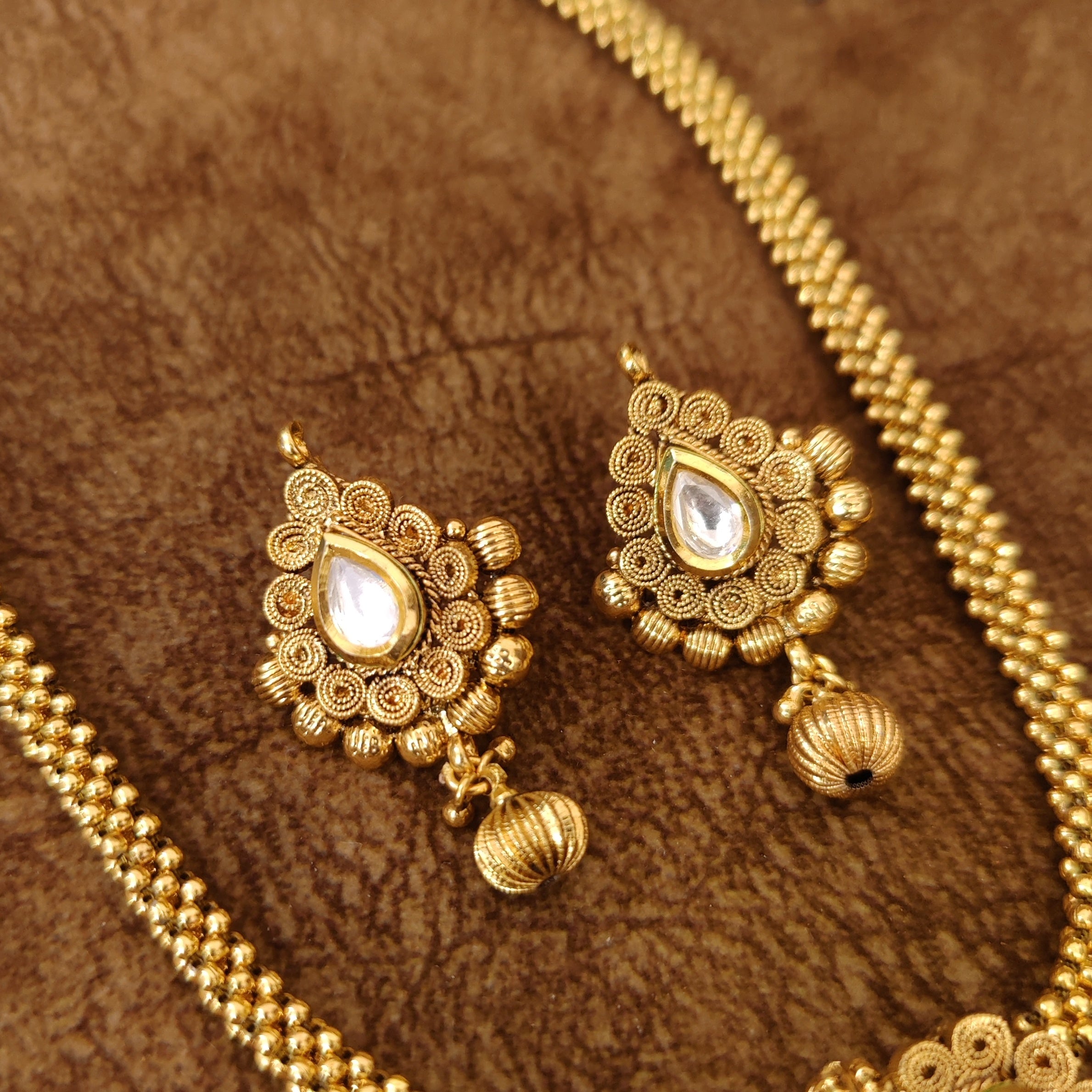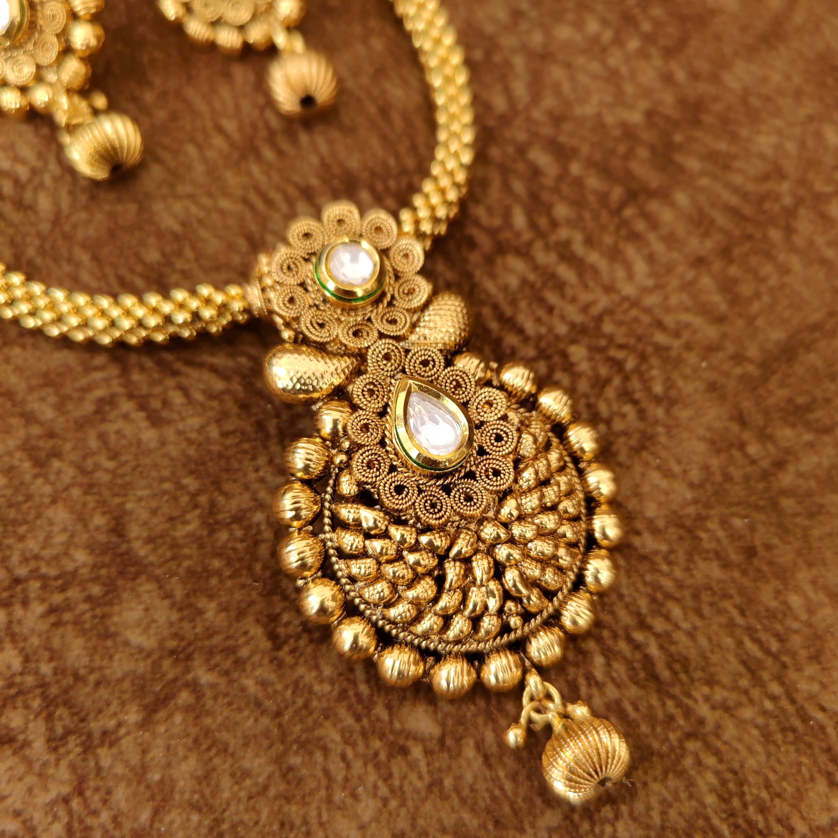 These beautiful necklace set are handcrafted in copper alloy with imitation kundan & polki work of very fine quality . These necklace set are coated with 18 kt gold polish which give them a unique look . An absolutely stunning piece to own and are very light in weight.