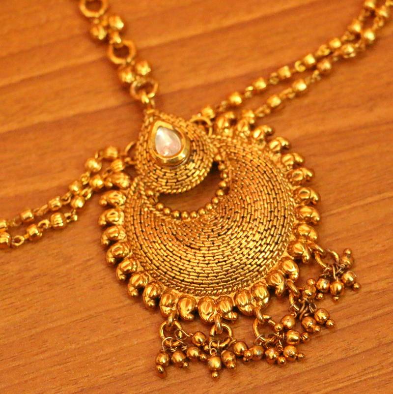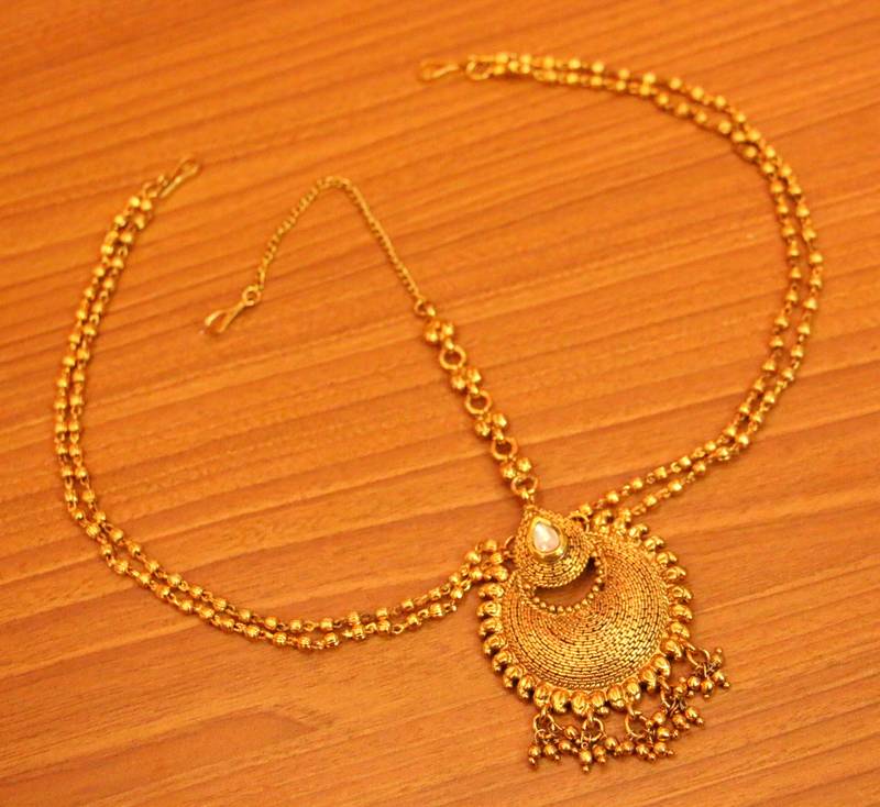 This Antique Gold Look Bridal Mathapatti Is Handcrafted In Copper Alloy With 18kt Fine Gold Plating . This Mathapatti Is Very Light In Weight And Gives You A Real Gold Look. An Absolutely Stunning Piece To Own And Are Very Light In Weight.
