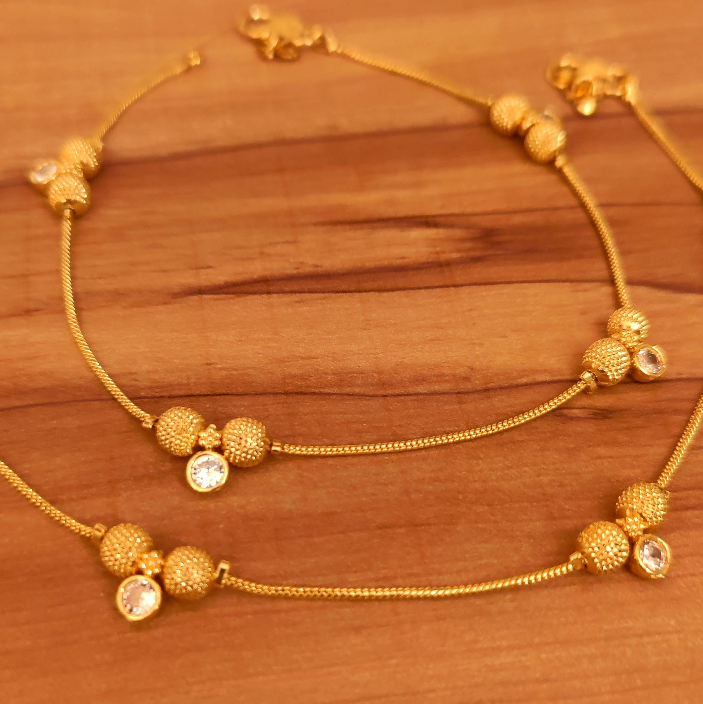 These gold plated anklets are handcrafted in brass alloy with fine cz stones and gold plated metal balls. these anklets are plated in 18 kt fine gold plating and are very light in weight.