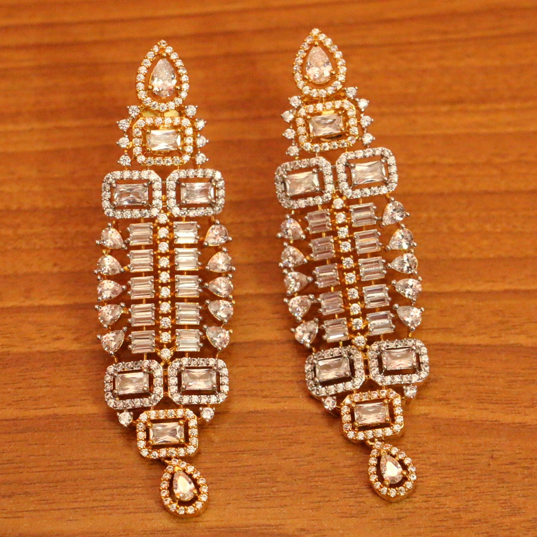 These earrings are handcrafted in silver alloy with imitation american diamond work of very fine quality. These artistic yet modern earrings are plated with high quality 18kt gold rhodium. The earrings are very light in weight.