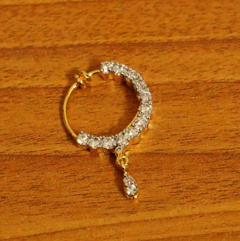 This nose ring is handcrafted in silver alloy with imitation american diamond stones of very fine quality , this nose ring is coated with 18kt nickle free gold plating to avoid skin allergies and its very light in weight .