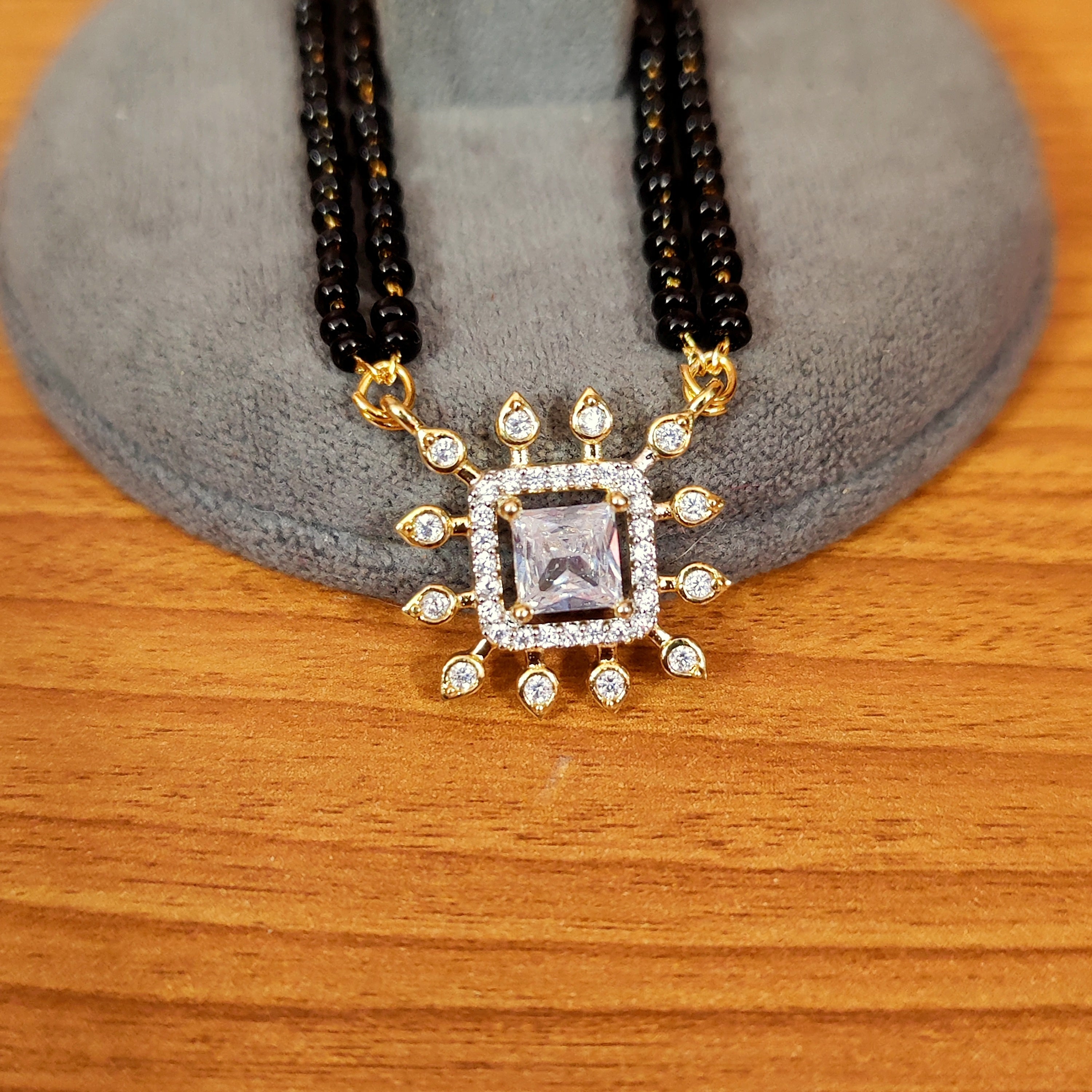 This beautiful mangalsutra is handcrafted in silver & brass alloy with imitation premium quality cz stones of very fine quality . Give this typical Mangal Sutra a new and classy look and make this necessary jewellery a fashion statement with this gorgeously crafted Mangalsutra with cz stones that glitter like diamonds with a golden touch teamed with the auspicious black beads.