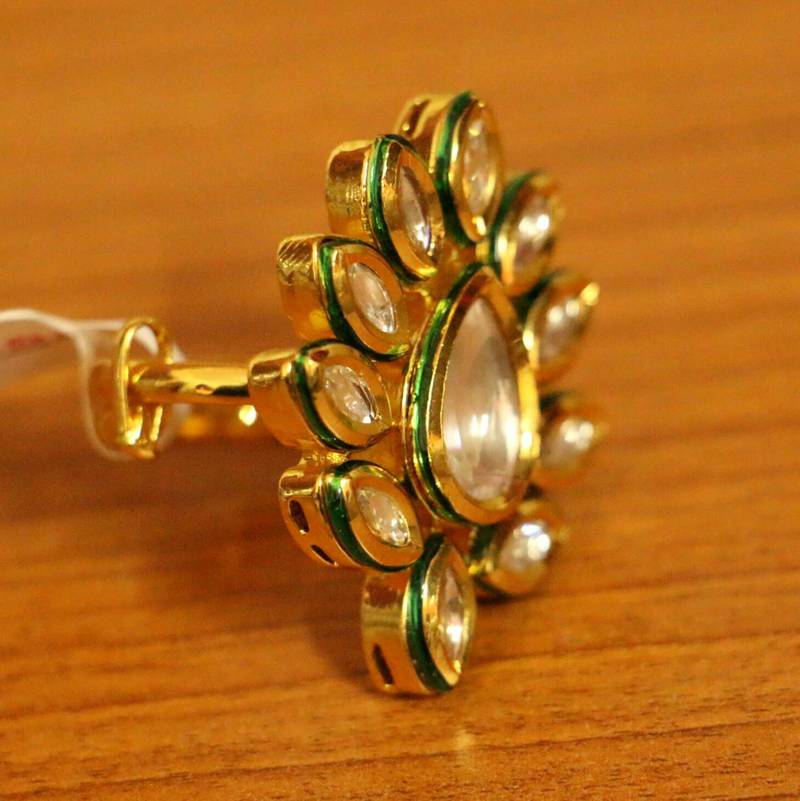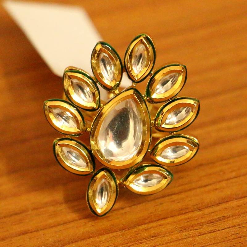 This beautiful ring is handcrafted in brass alloy with imitation kundan with meenakari work of very fine quality . This ring is coated with 18 kt gold polish which give them a unique look . An absolutely stunning piece to own and are very light in weight.