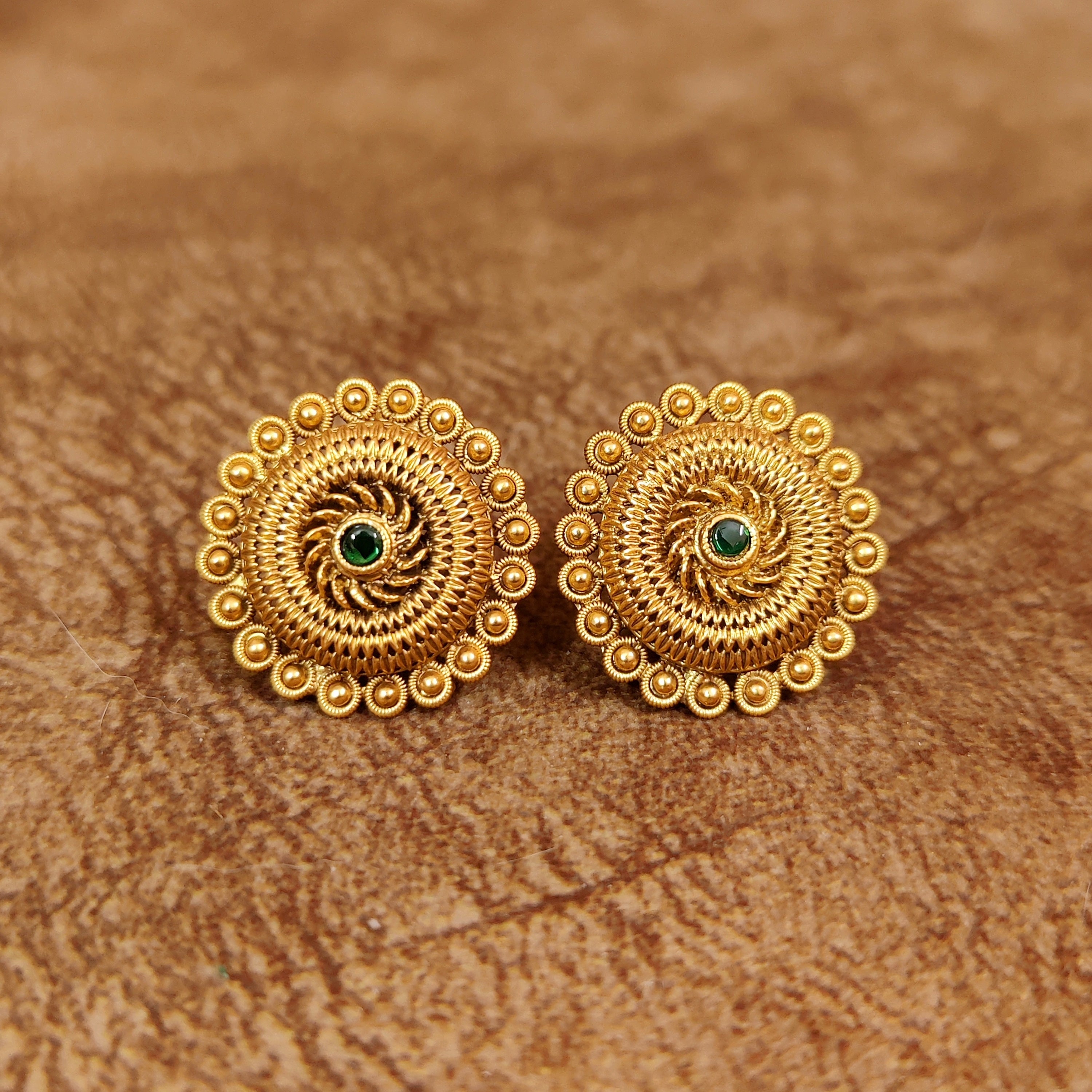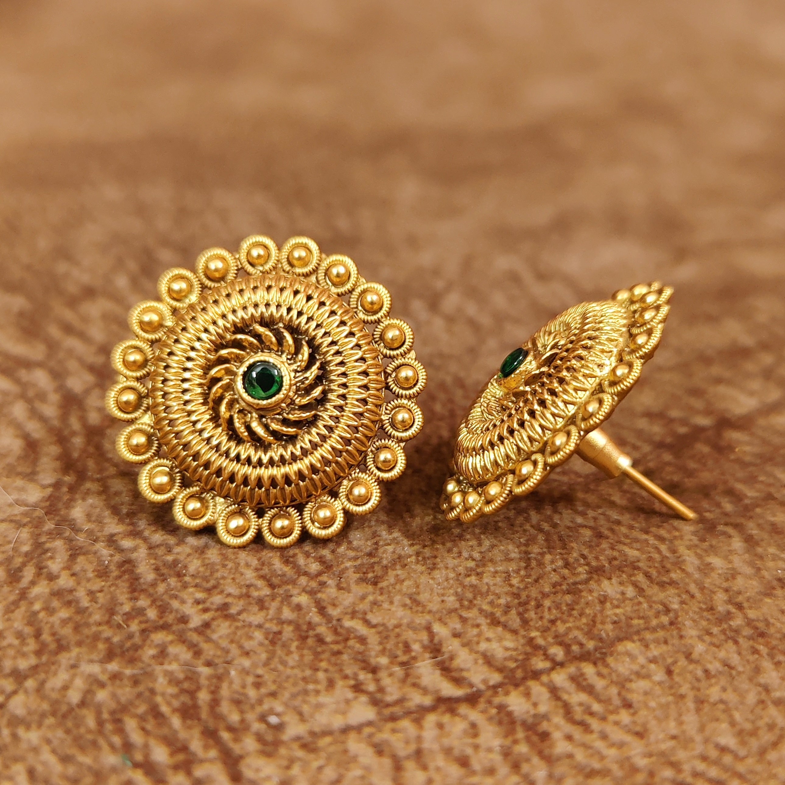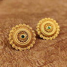 Add a touch of elegance to your jewelry collection with our Gold-Plated Round Shaped Green Studs. These stunning earrings feature a vibrant green center stone encased in a gleaming gold-plated setting, offering a perfect blend of sophistication and modern style. Ideal for both everyday wear and special occasions, these studs are designed to complement any outfit effortlessly. Discover the exquisite craftsmanship and timeless beauty of these earrings from Sanvi Jewels.