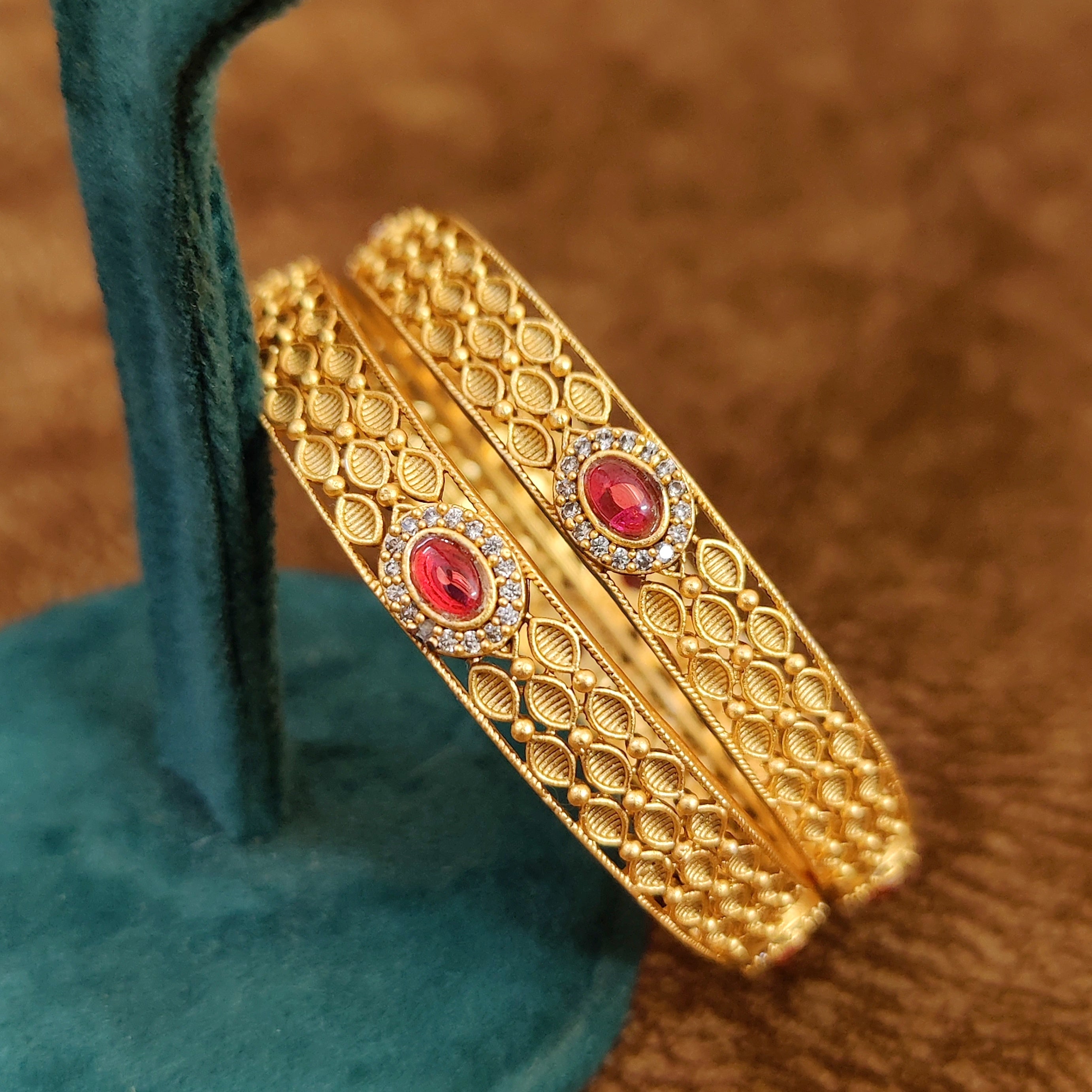 Elevate your elegance with the Gold-Plated Ruby AD Bangles, a perfect blend of traditional charm and modern sophistication. Featuring dazzling ruby-colored American diamonds set in a radiant gold-plated finish, these bangles are designed to make a statement. Ideal for weddings, festive occasions, or special events, they pair beautifully with ethnic and fusion outfits, adding a regal touch to your look.
