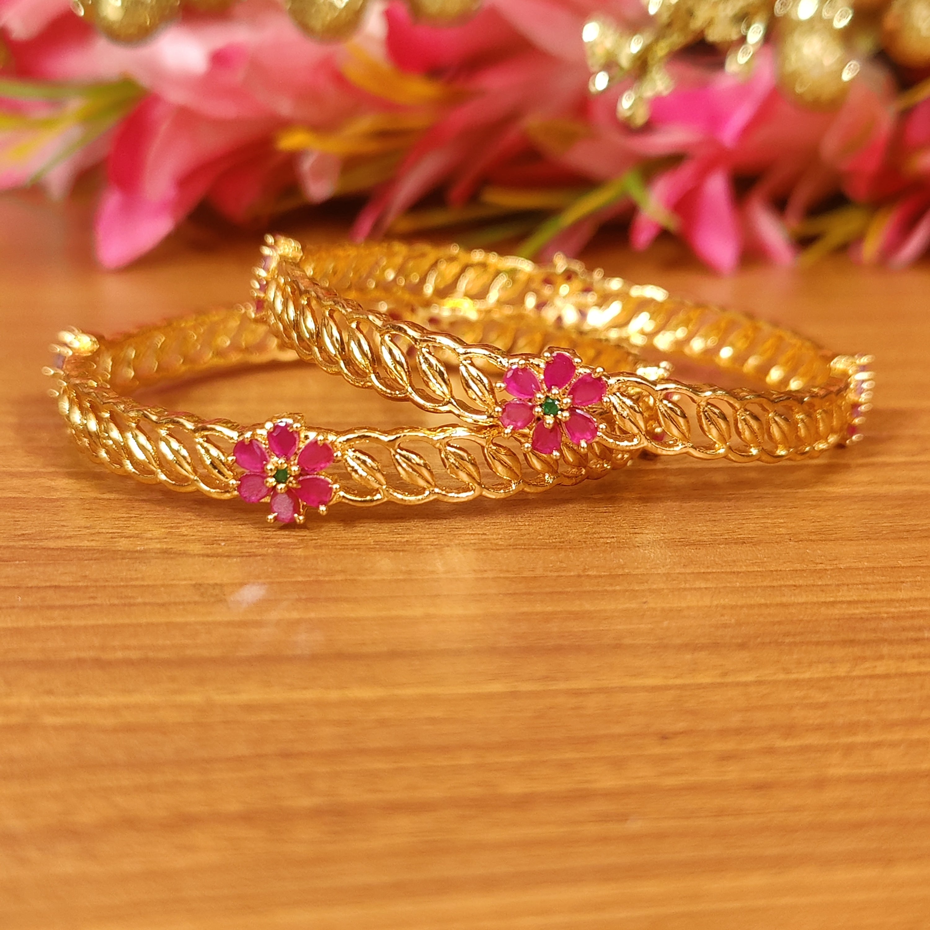 This set of gold plated bangles features stunning ruby and emerald colour stones, adding a touch of glamour to any outfit. The lightweight design and fine craftsmanship make them comfortable to wear, while the beautiful flower pattern adds an elegant touch. Upgrade your jewelry collection with these exquisite bangles.