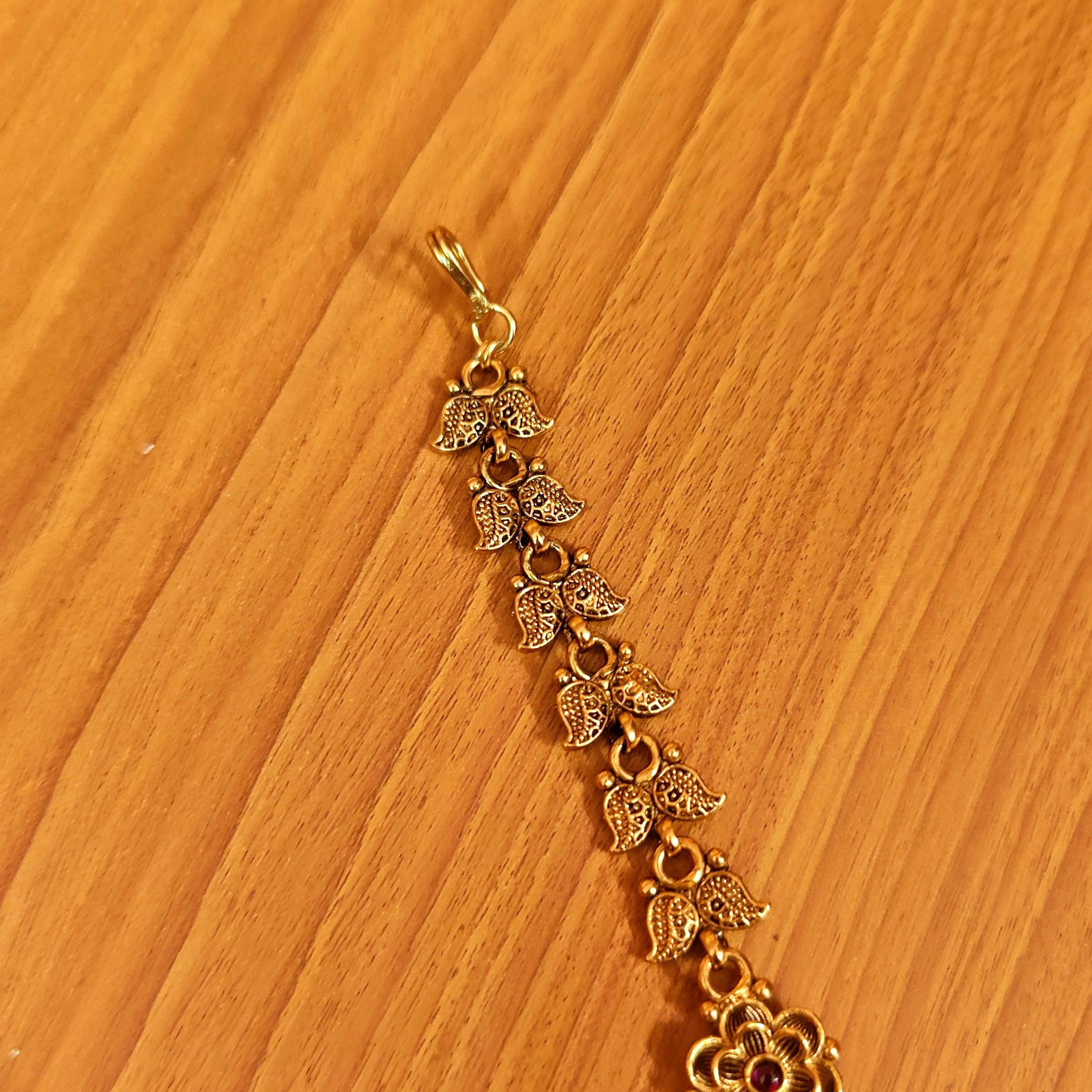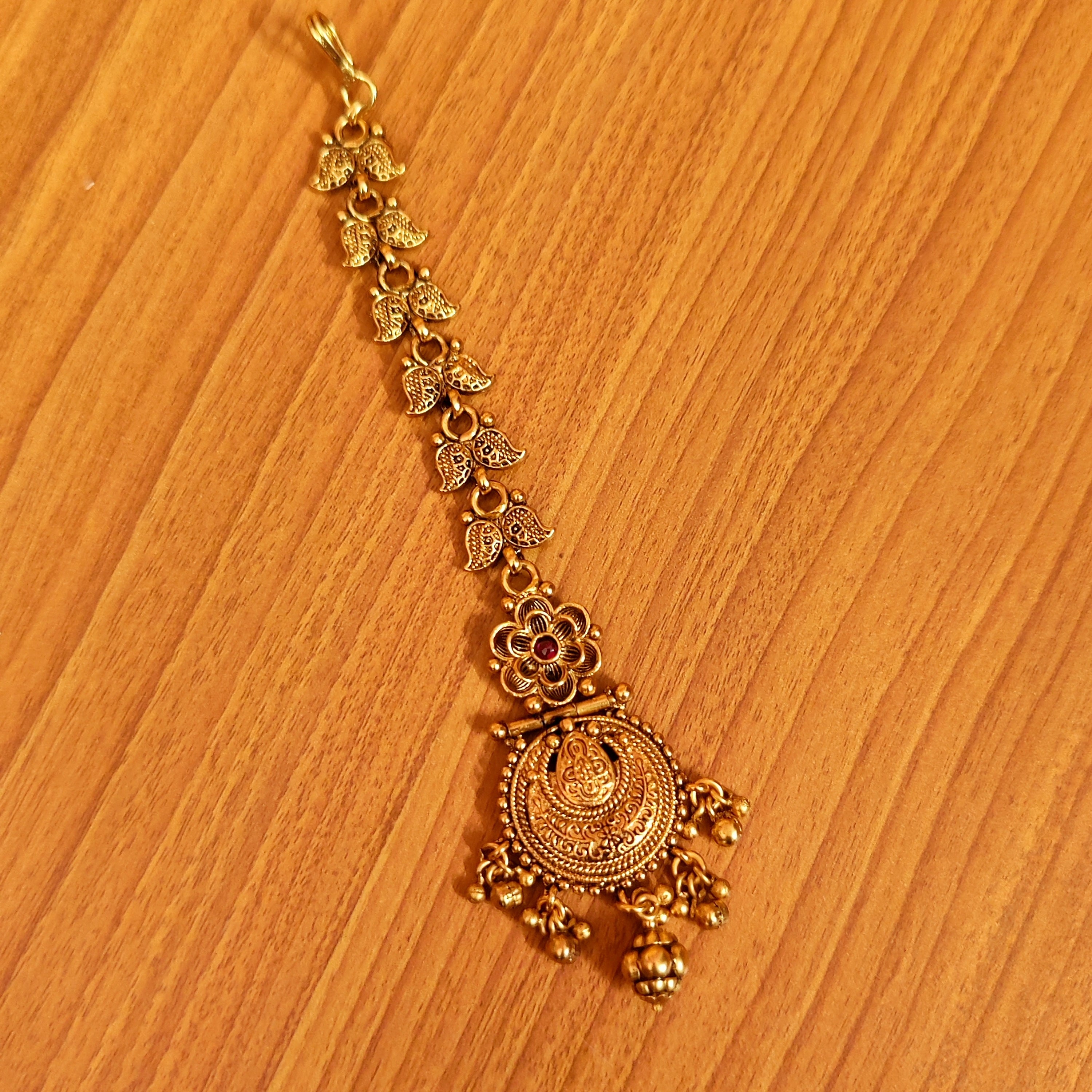 This beautiful bridal look mathapatti is handcrafted in copper alloy with minute & intricate gold work of very fine quality . This mathapatti is coated with 22 Kt matt gold plating which gives a very real look to the design . An absolutely gorgeous piece and is very light in weight.