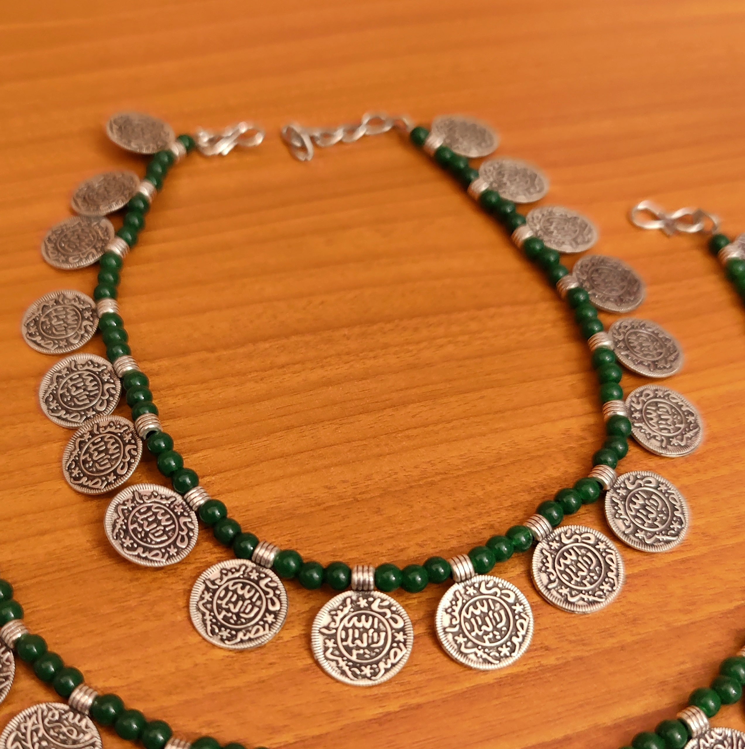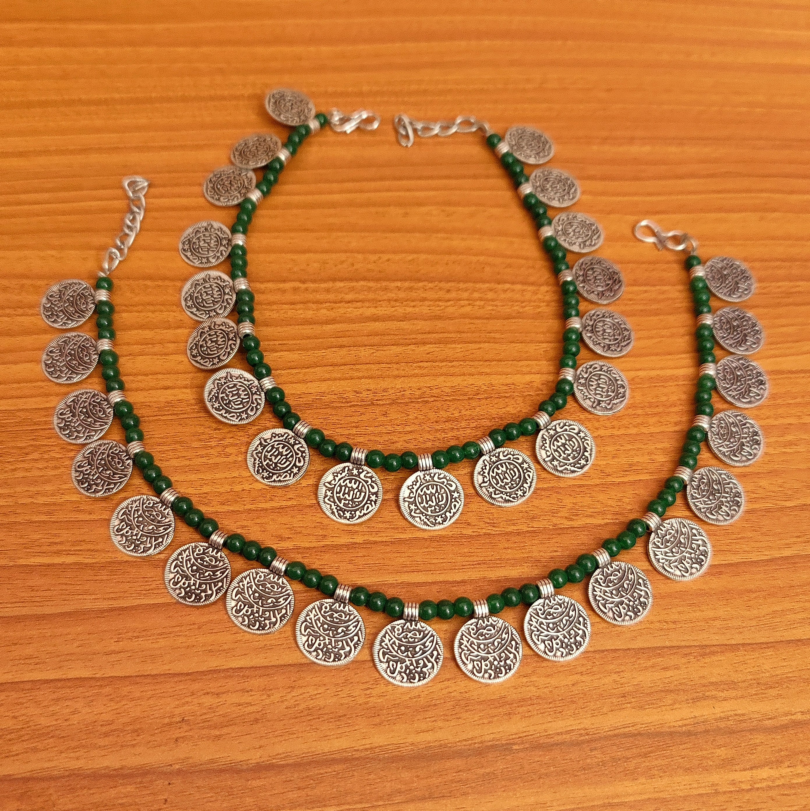 GREEN BEADS SILVER COIN ANKLETS