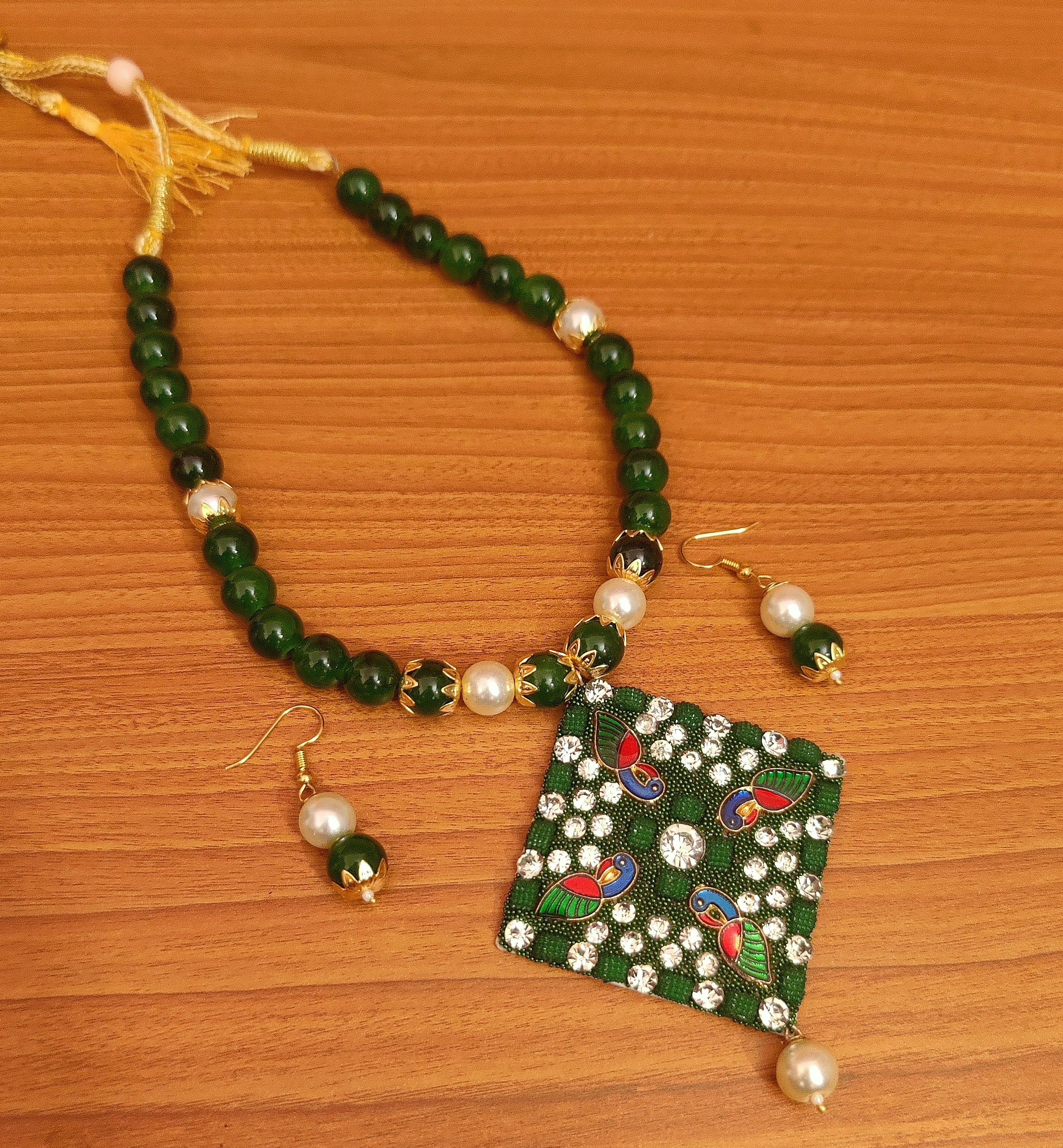 This imitation necklace set is handcrafted in copper alloy with imitation dark green colour beads of very fine quality . This necklace set is plated with gold plating and is light in weight.