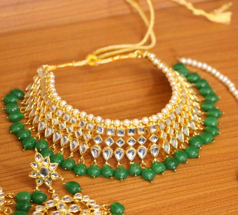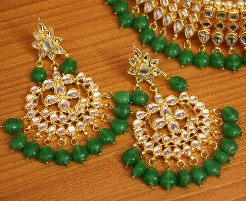 This Kundan Polki Necklace Set Is Handcrafted In Silver Alloy With Imitation Emerald Colour Stones And Kundan Polki Stones Of Fine Quality , The Necklace Set Is Plated In 18kt Gold Plating And The Design Itself Is Perfect For Wedding Attires.
