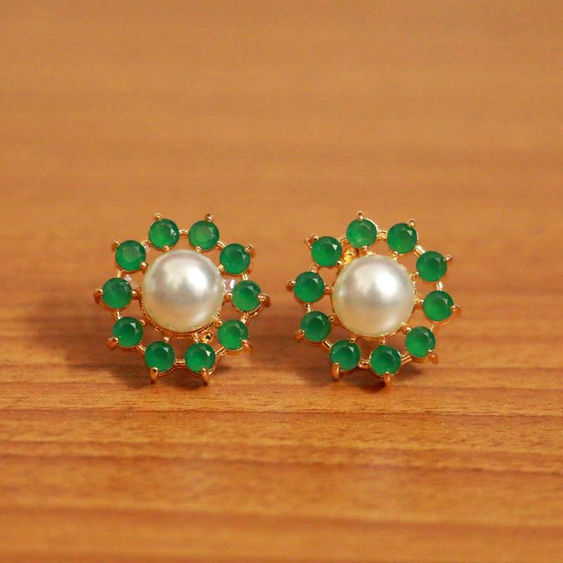 These diamond look studs are handcrafted in silver alloy with imitation pearls & emerald colour stones of very fine quality. These earrings are plated in 18kt gold rhodium plating which gives the design a real jewelry look , these earrings are very light in weight.