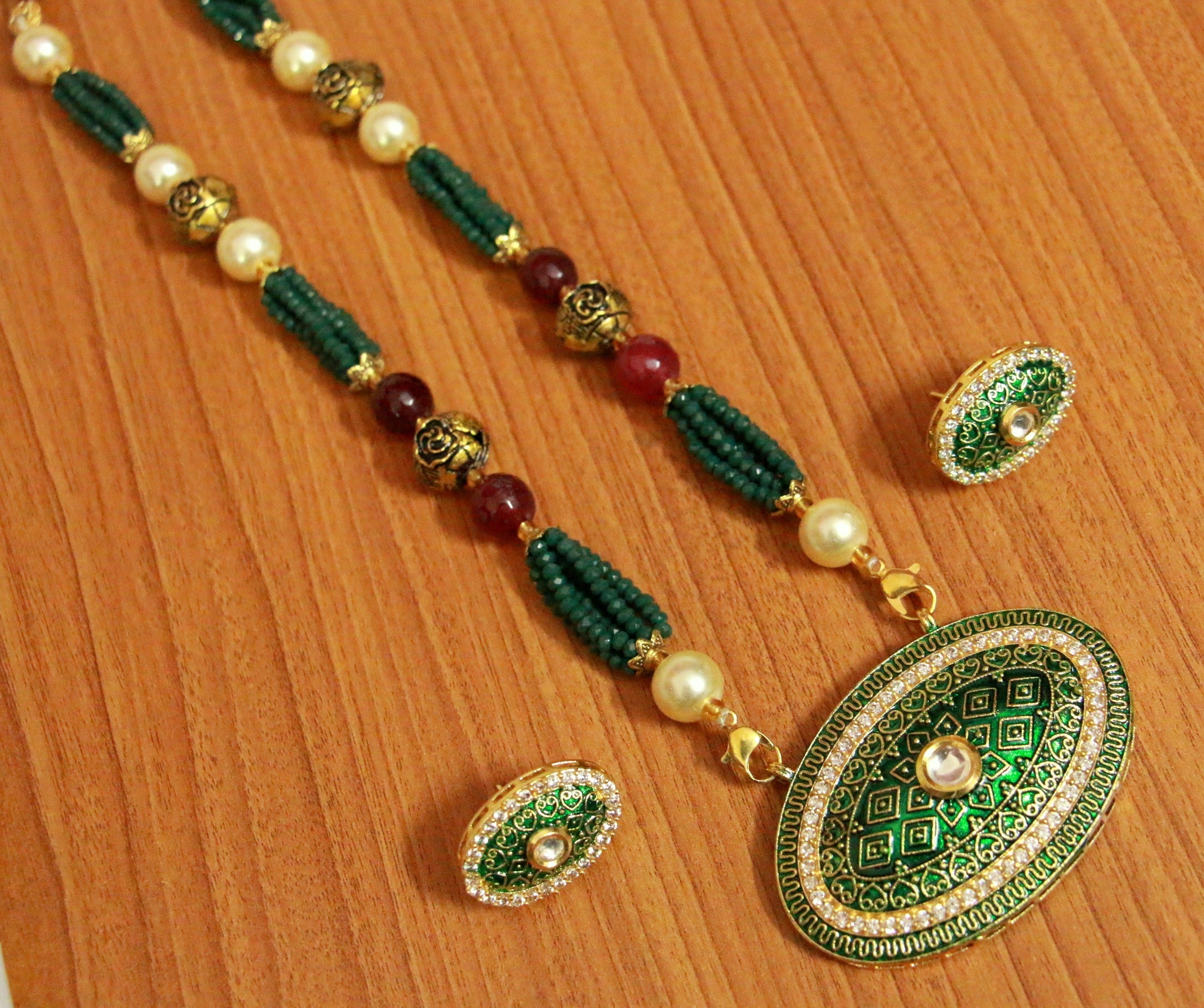 These beautiful pendant set are handcrafted in brass alloy with imitation pearl, ruby, green onyx, american diamond & kundan with meenakari work of very fine quality. These pendant set are coated with 18 kt gold polish which give them a unique look . An absolutely stunning piece to own and are very light in weight.