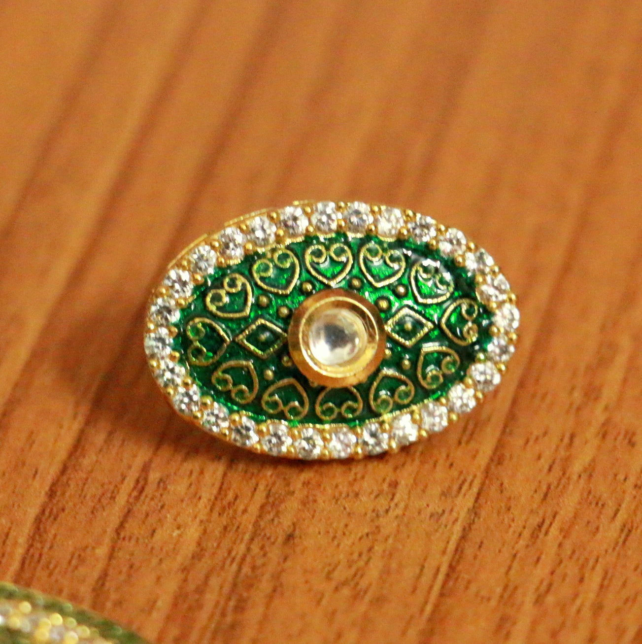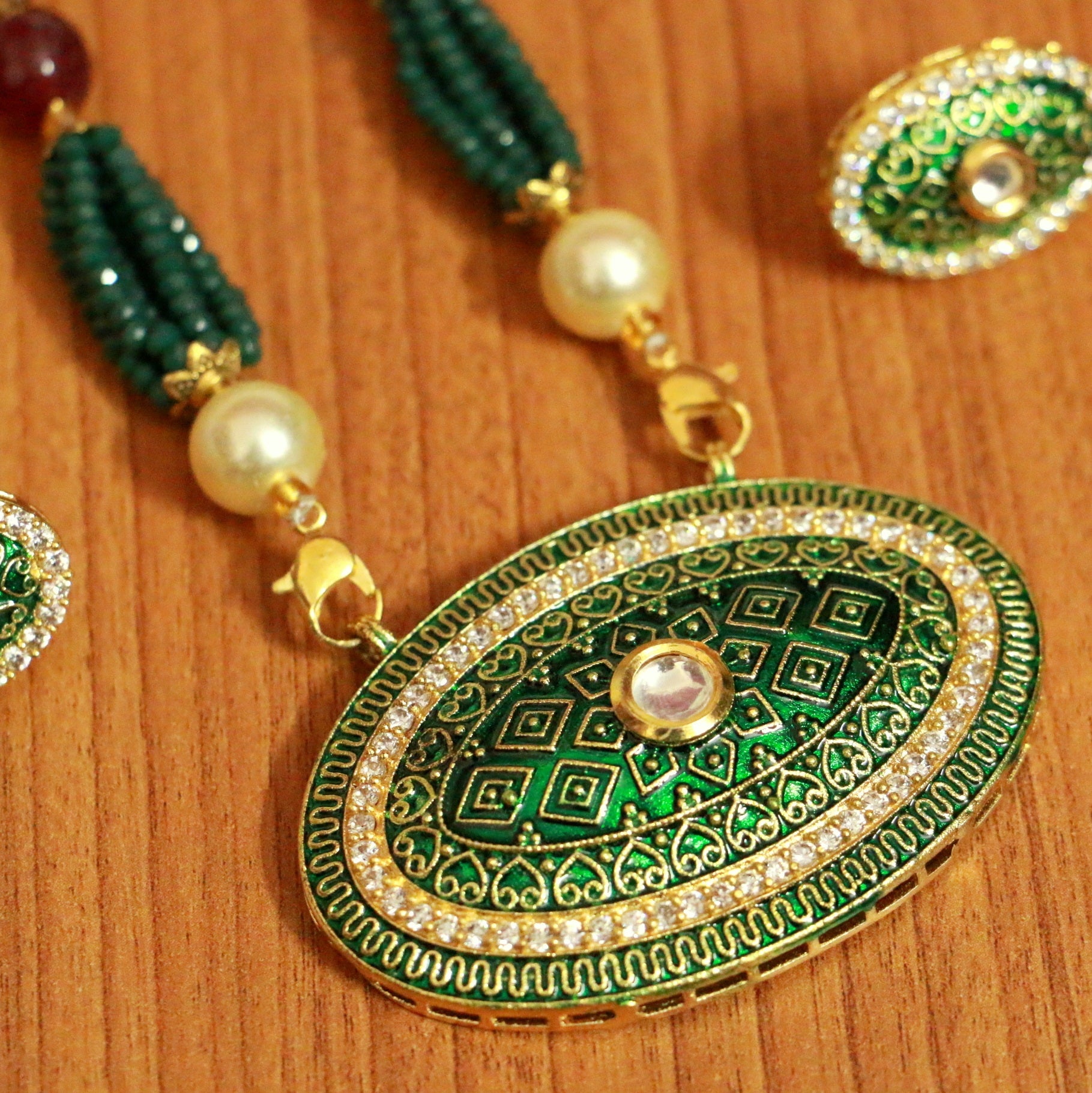 Green Kundan Meenakari Oval Shaped Pendant Set