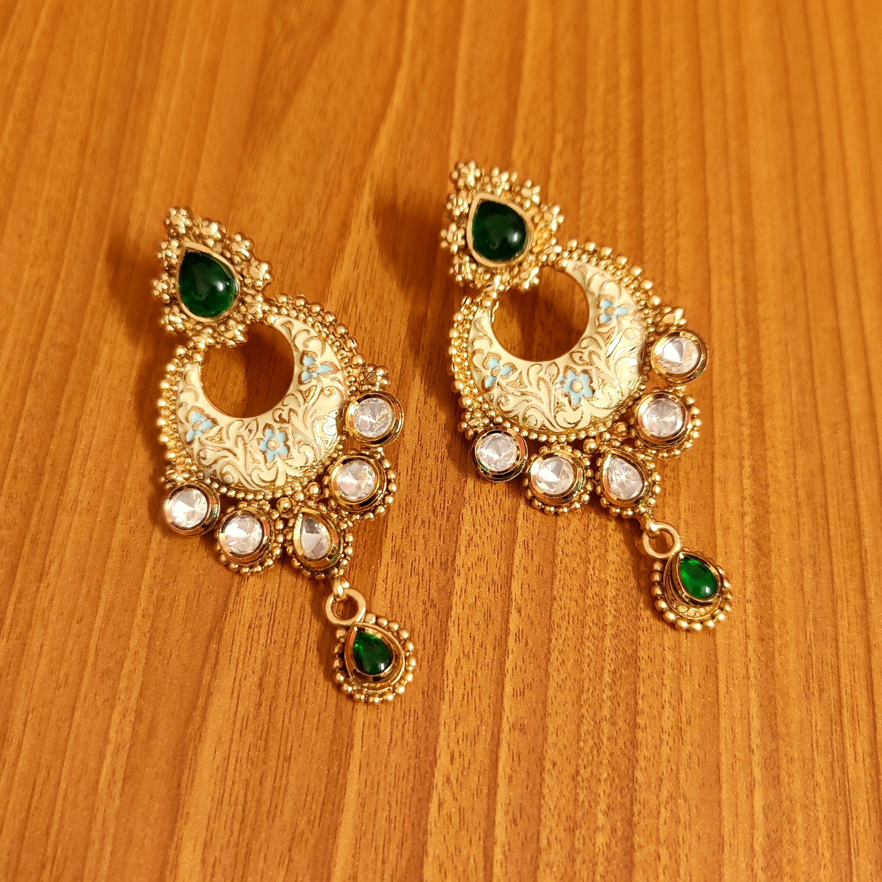 Get the perfect combination of elegance and style with our GREEN KUNDAN POLKI WITH MEENAKARI NECKLACE SET! Featuring stunning green emerald and kundan polki stones, with intricate meenakari work, this 18kt gold plated set is perfect for weddings, parties, or any special occasion. The paisley look and unique design will make you stand out from the crowd. Complete your look with the perfect matching pair of earrings. Experience the trend and make a statement on your special day!