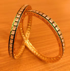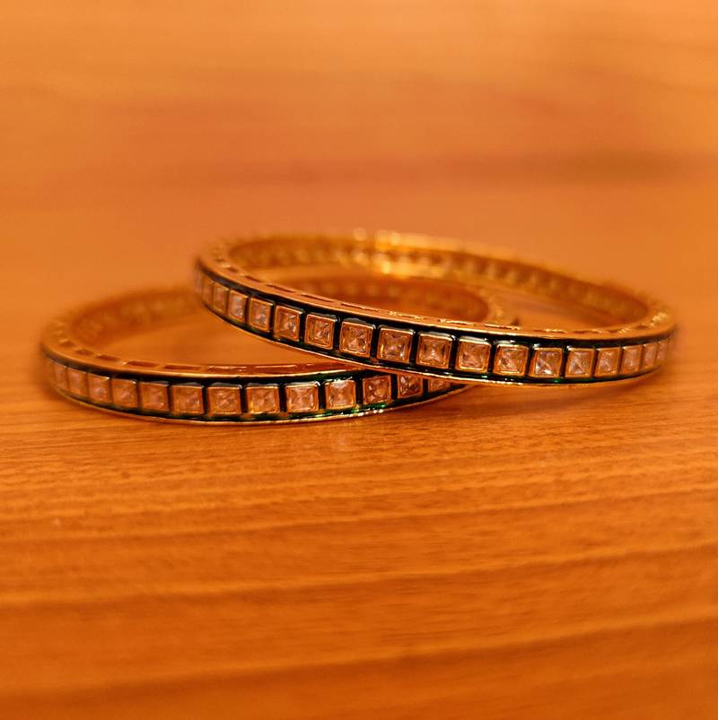 These bangles are handcrafted in copper alloy with imitation zircon & green colour meenakari work of very fine quality. These artistic yet modern bangles are plated with fine nickle free gold rhodium to avoid any allergies to the skin.