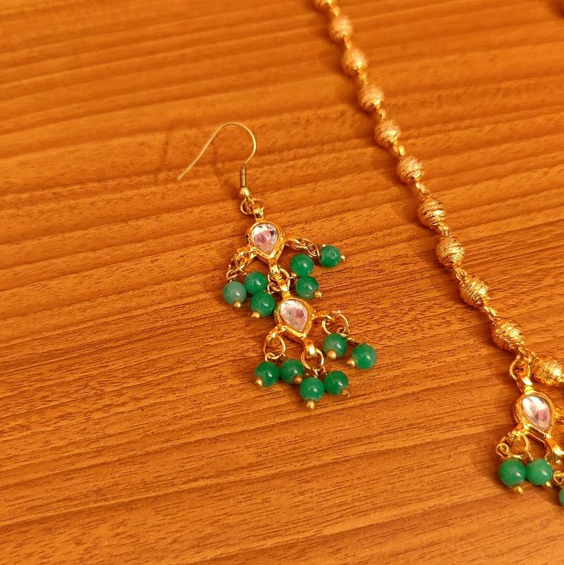 This Kundan Polki Necklace Set Is Handcrafted In copper Alloy With Imitation green colour beads And Kundan Polki Stones Of Fine Quality , The Necklace Set Is Plated In 18kt Gold Plating And The Design Itself Is Perfect For Wedding Attires.