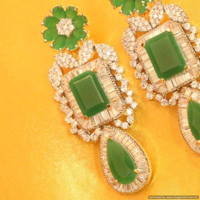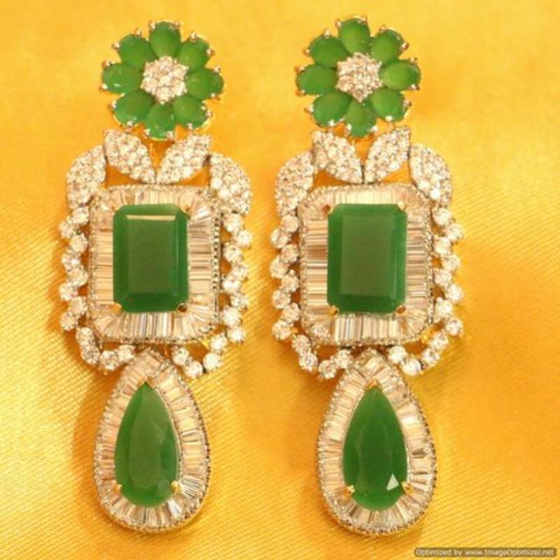 These diamond look danglers are handcrafted in silver alloy with imitation green emerald colour quartz & cz stones of very fine quality. These earrings are plated in 18kt gold rhodium plating which gives the design a real jewelry look .
