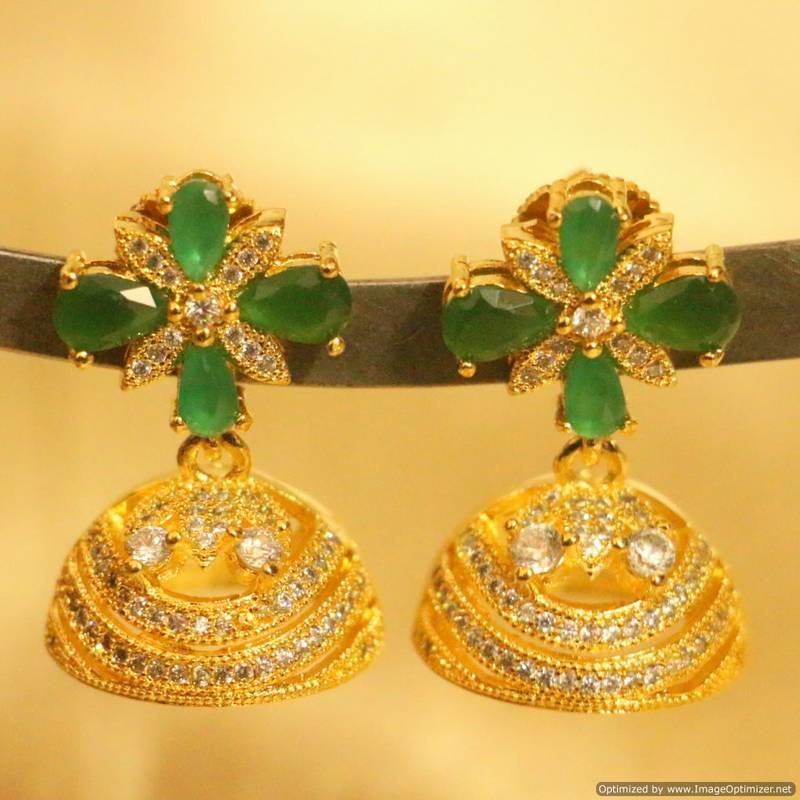 These diamond look jhumkas are handcrafted in silver alloy with imitation green emerald colour quartz & cz stones of very fine quality. These earrings are plated in 18kt gold rhodium plating which gives the design a real jewelry look .
