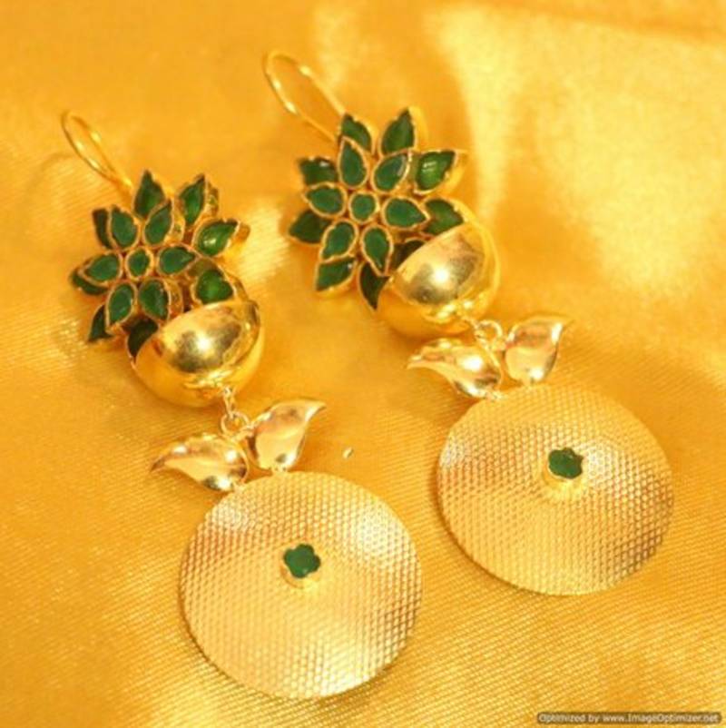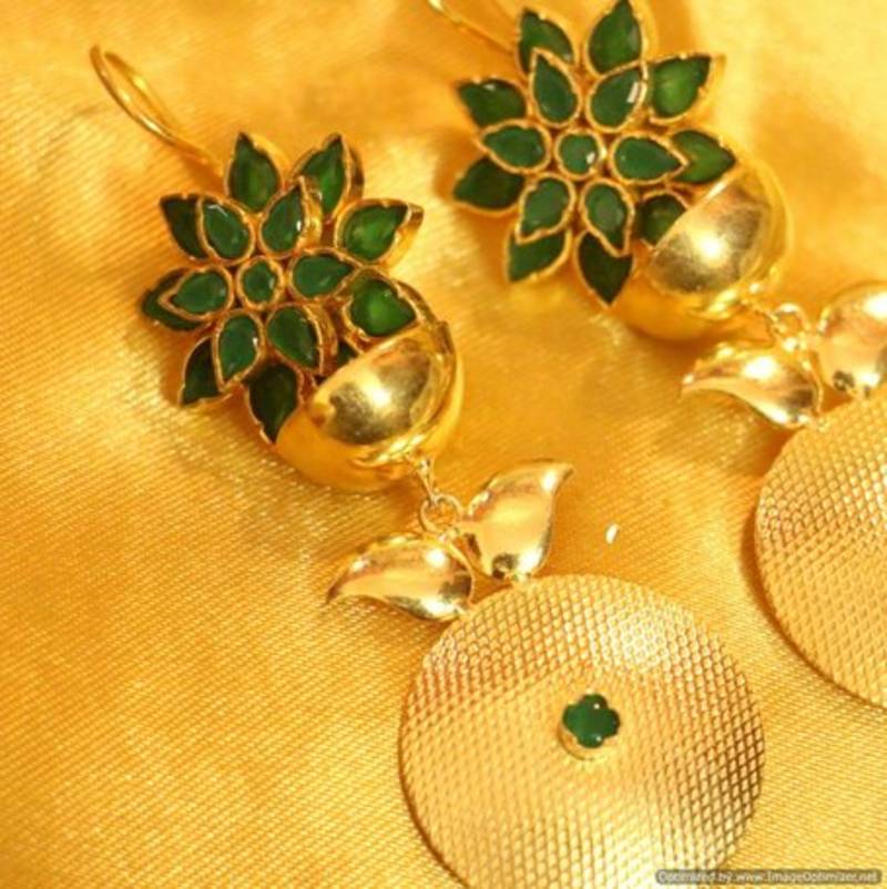 These beautiful earrings are handcrafted in copper alloy with imitation green onyx and polki work of very fine quality. These earrings are coated with 18 kt gold polish which give them a unique look . An absolutely stunning piece to own and are very light in weight.