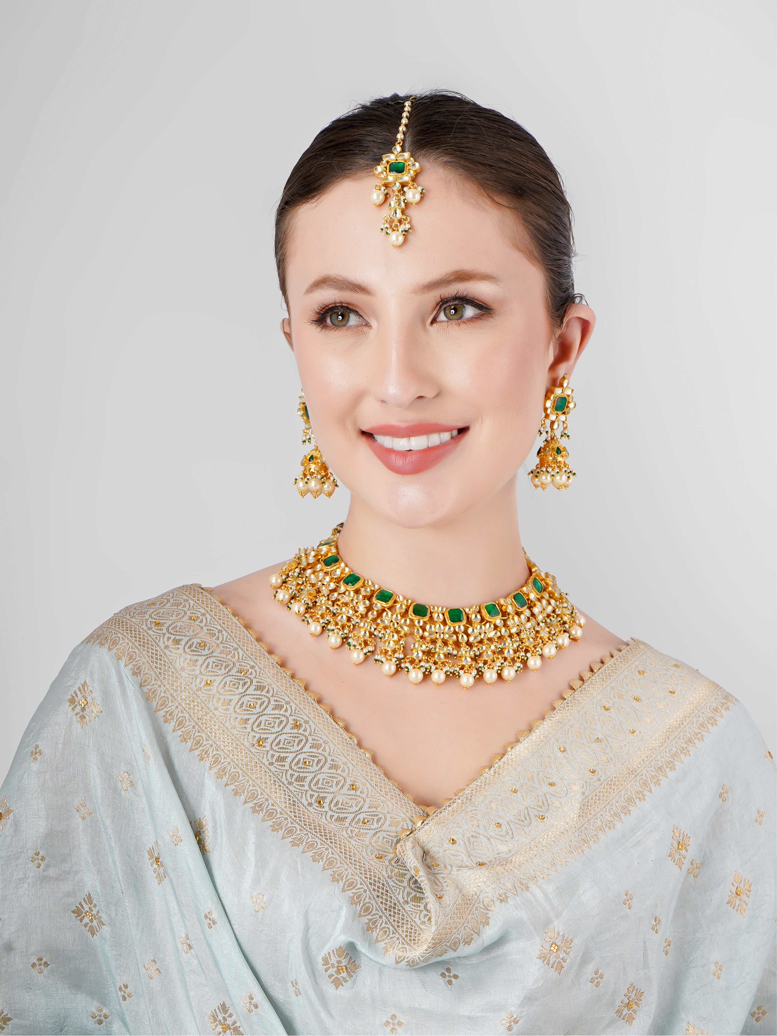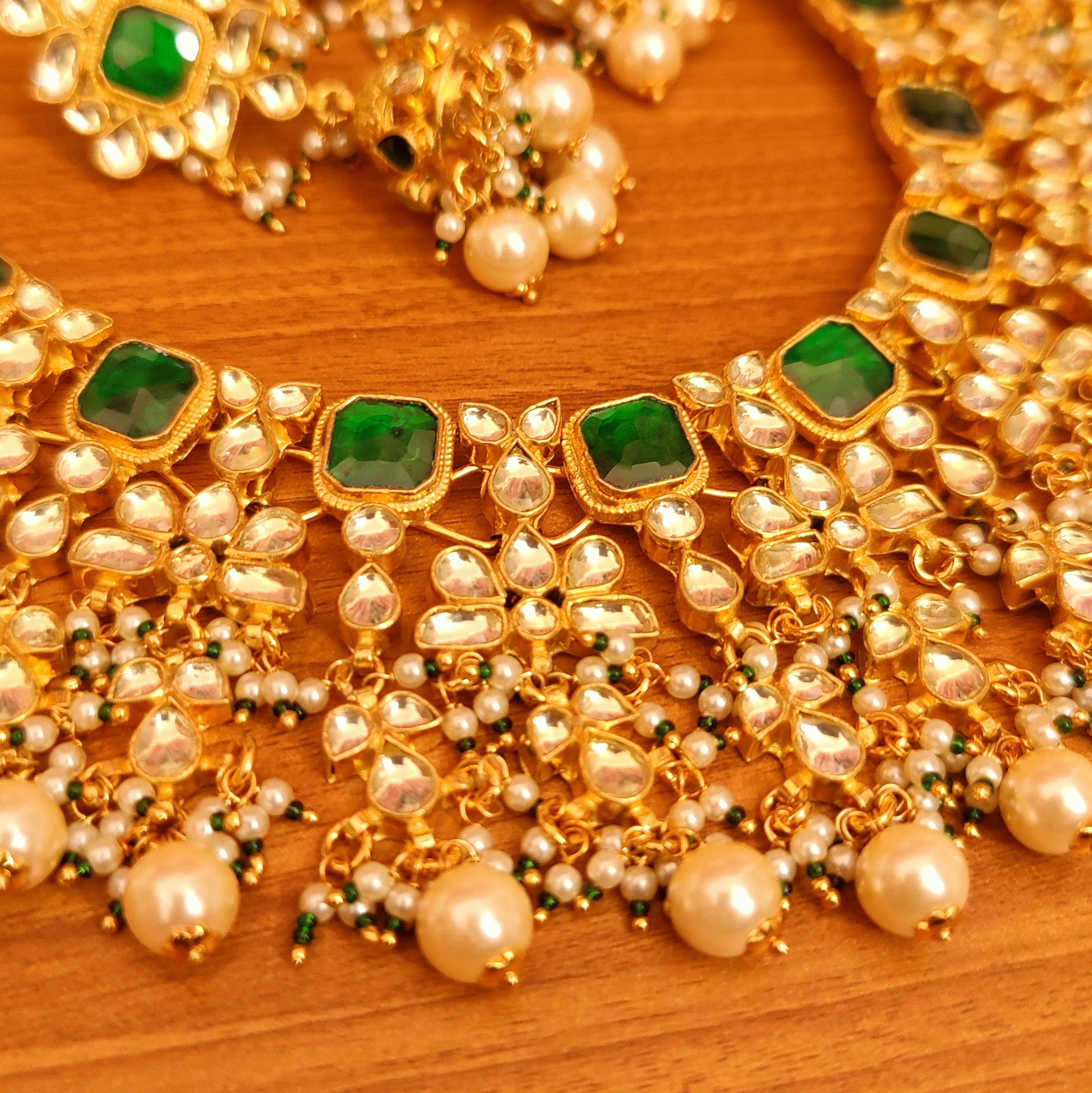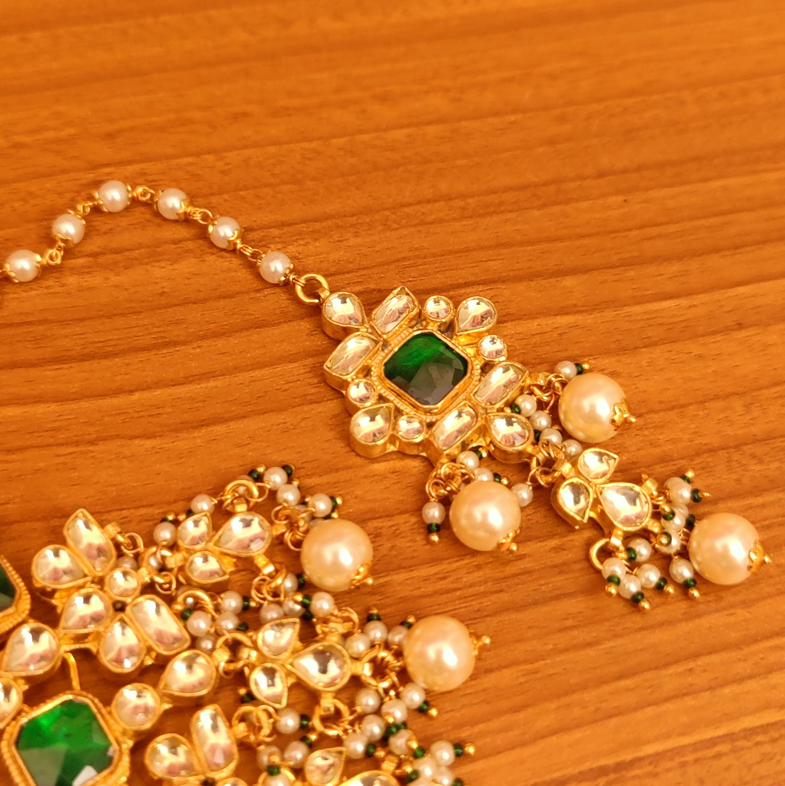 GREEN UNCUT KUNDAN POLKI & PEARL SEMI BRIDAL NECKLACE SET