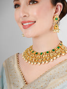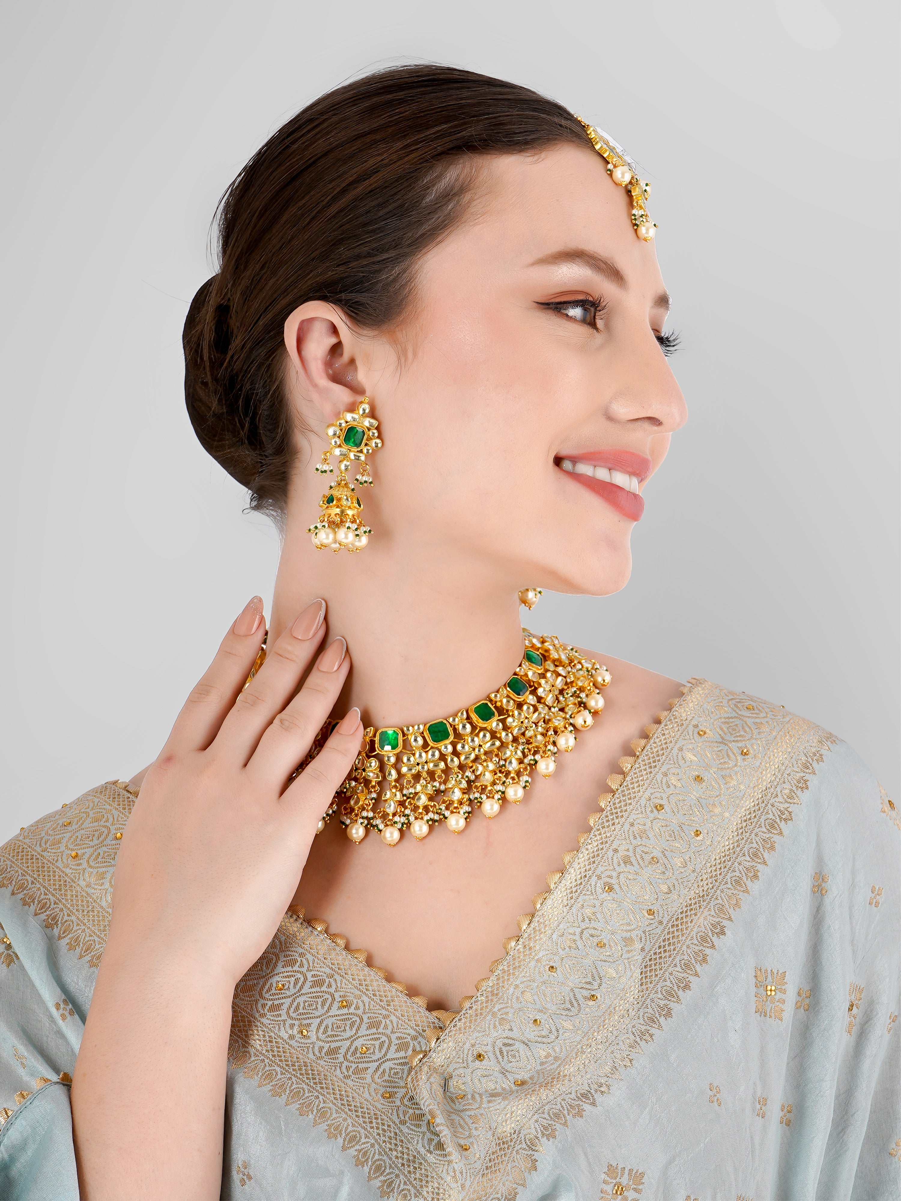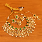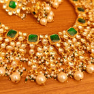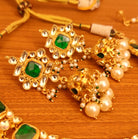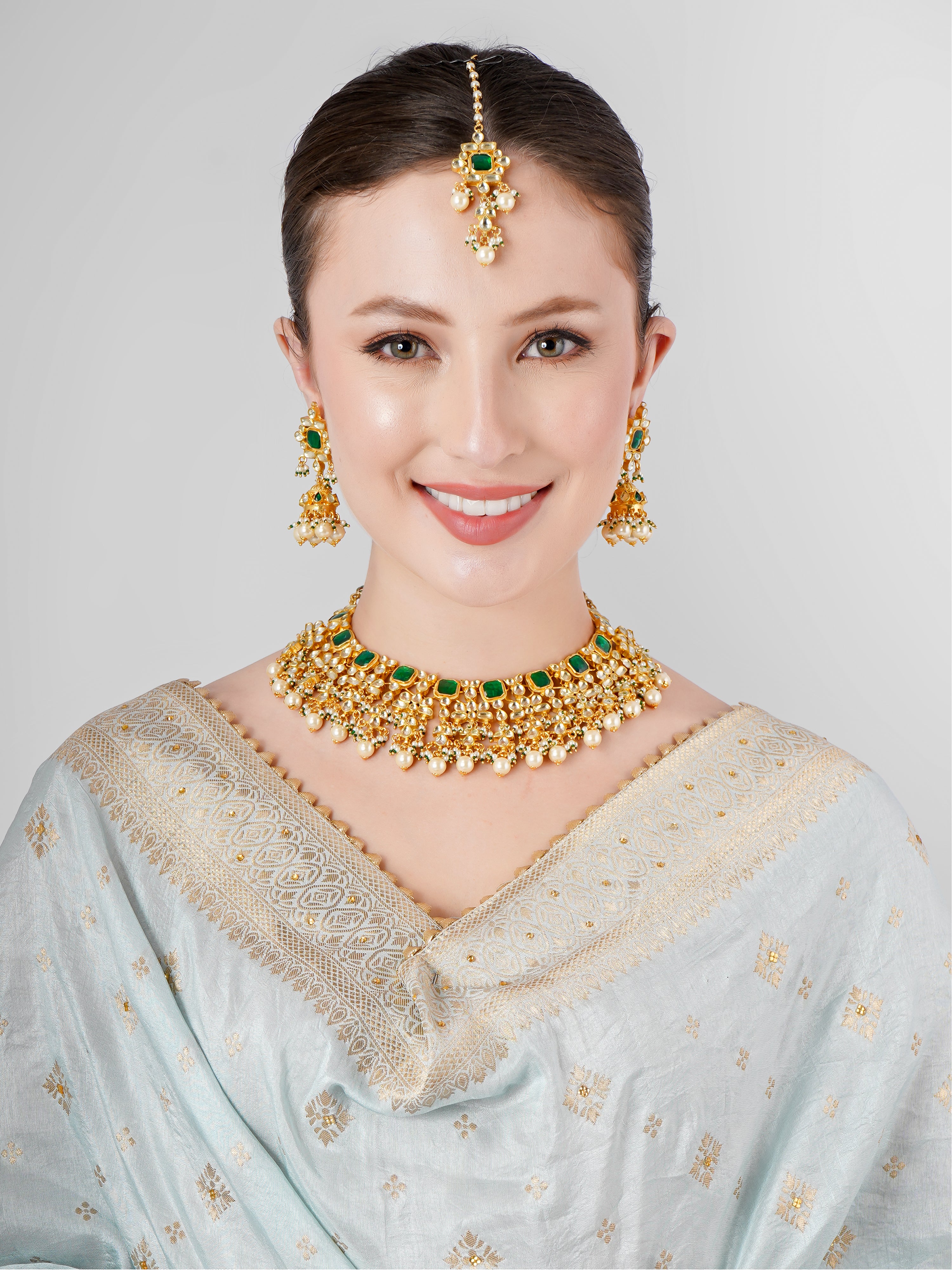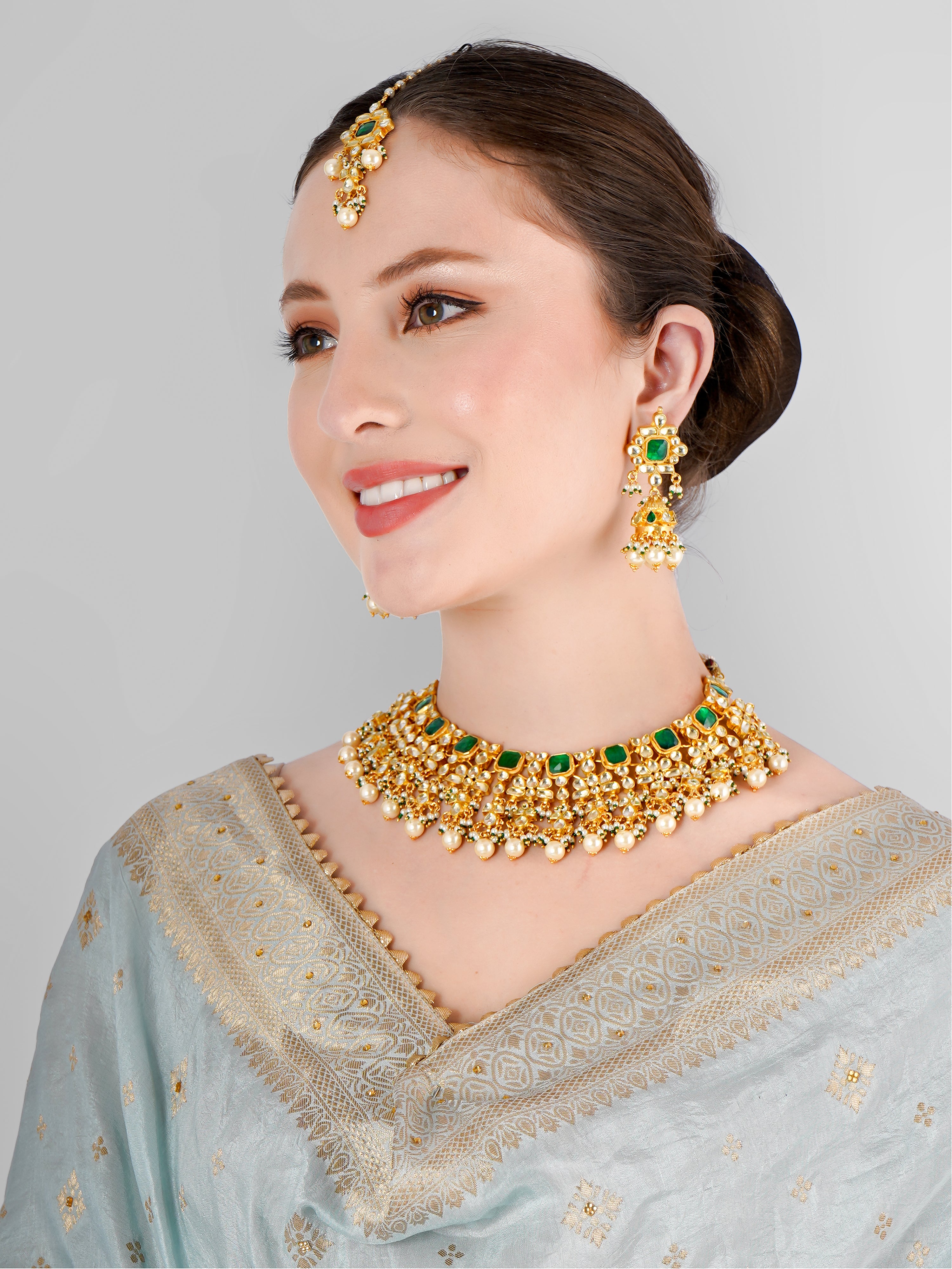 GREEN UNCUT KUNDAN POLKI & PEARL SEMI BRIDAL NECKLACE SET
