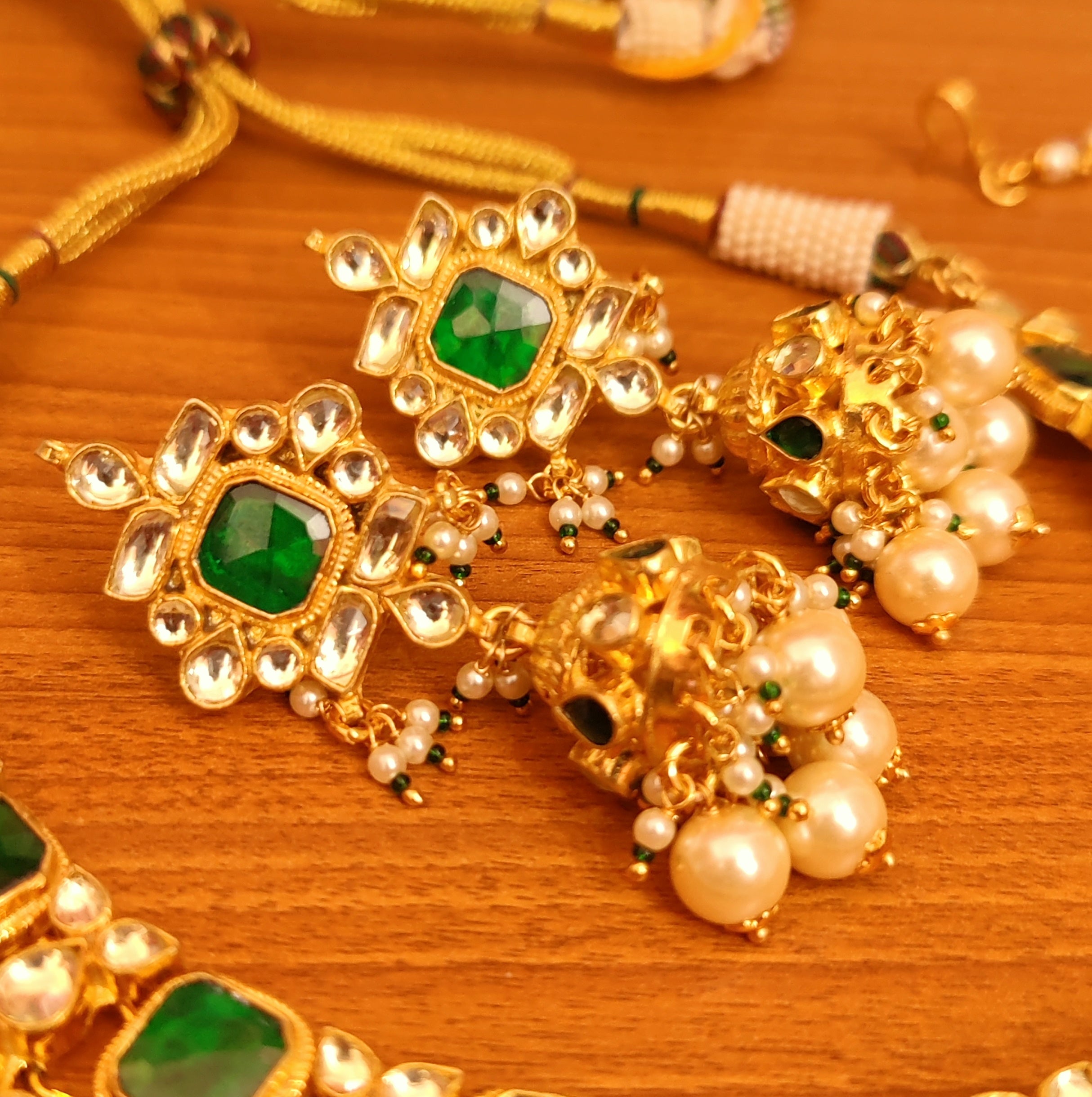 This necklace set is handcrafted in brass alloy with fine green onyx & kundan work of fine quality , the necklace set is plated with 18kt nickle free gold plating which gives it a real look .