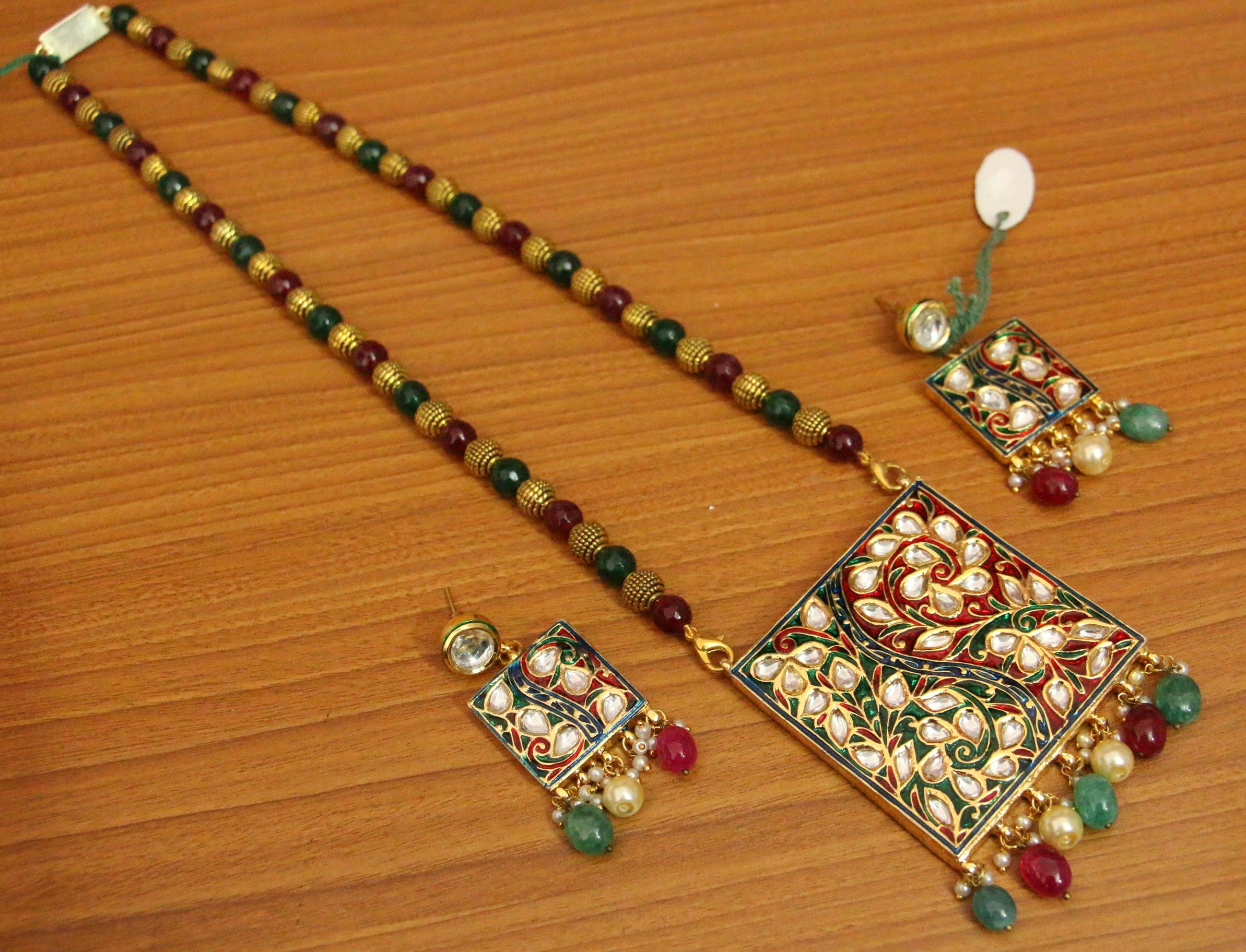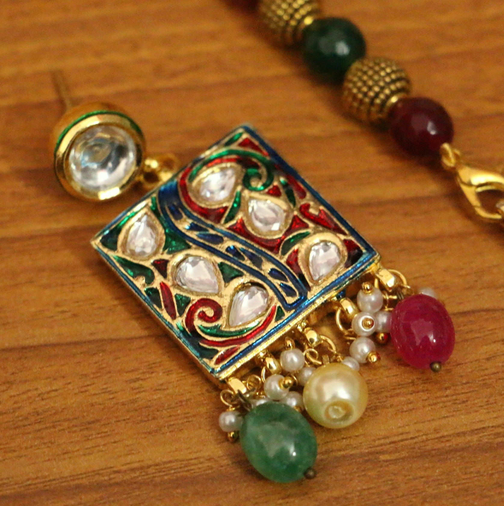 This multicolour kundan polki necklace set Is handcrafted in silver alloy with imitation kundan polki stone and semi precious bead & pearl. the necklace set is coated with 18kt gold plating and nickle free plating to avoid allergy to the skin.