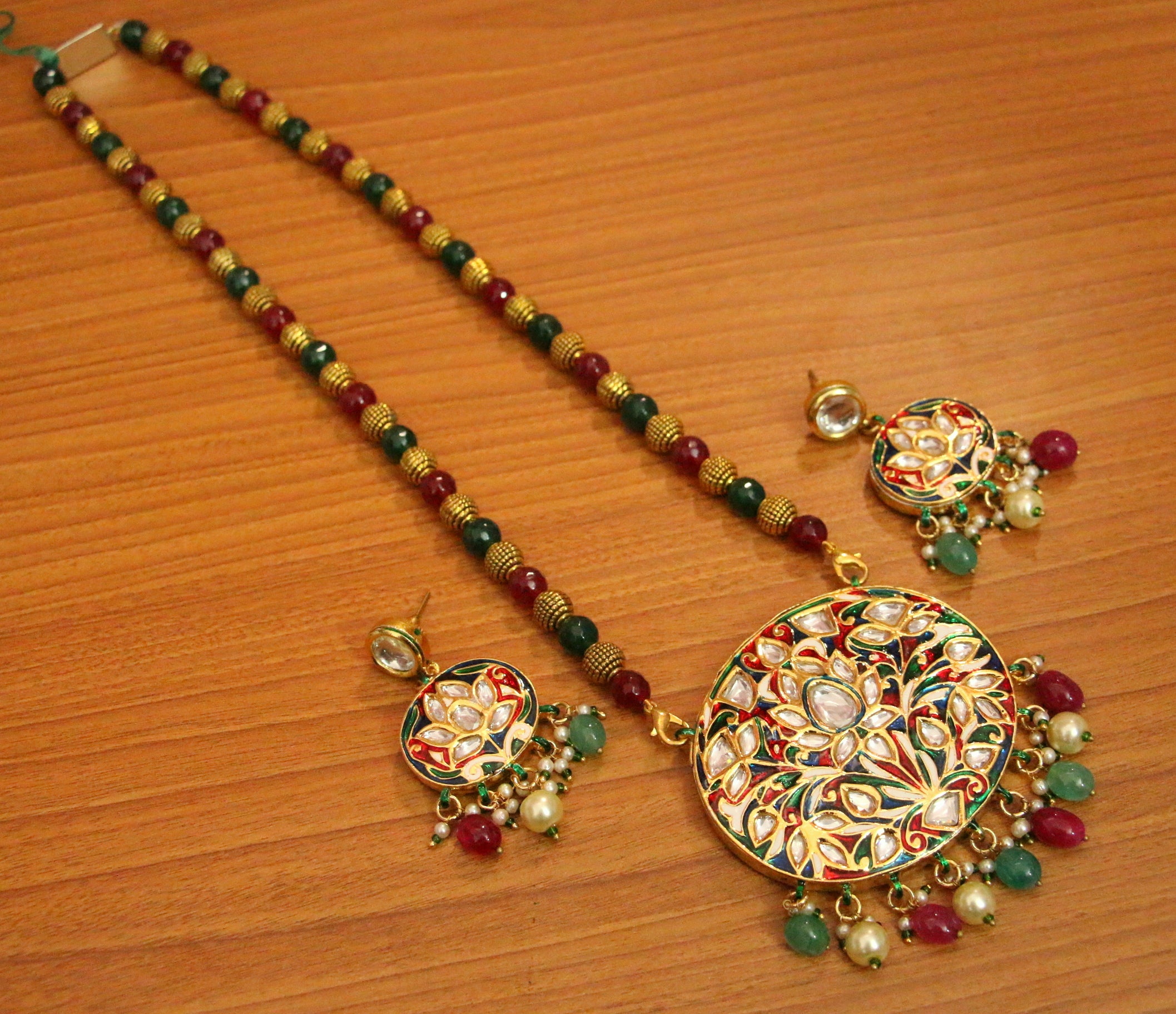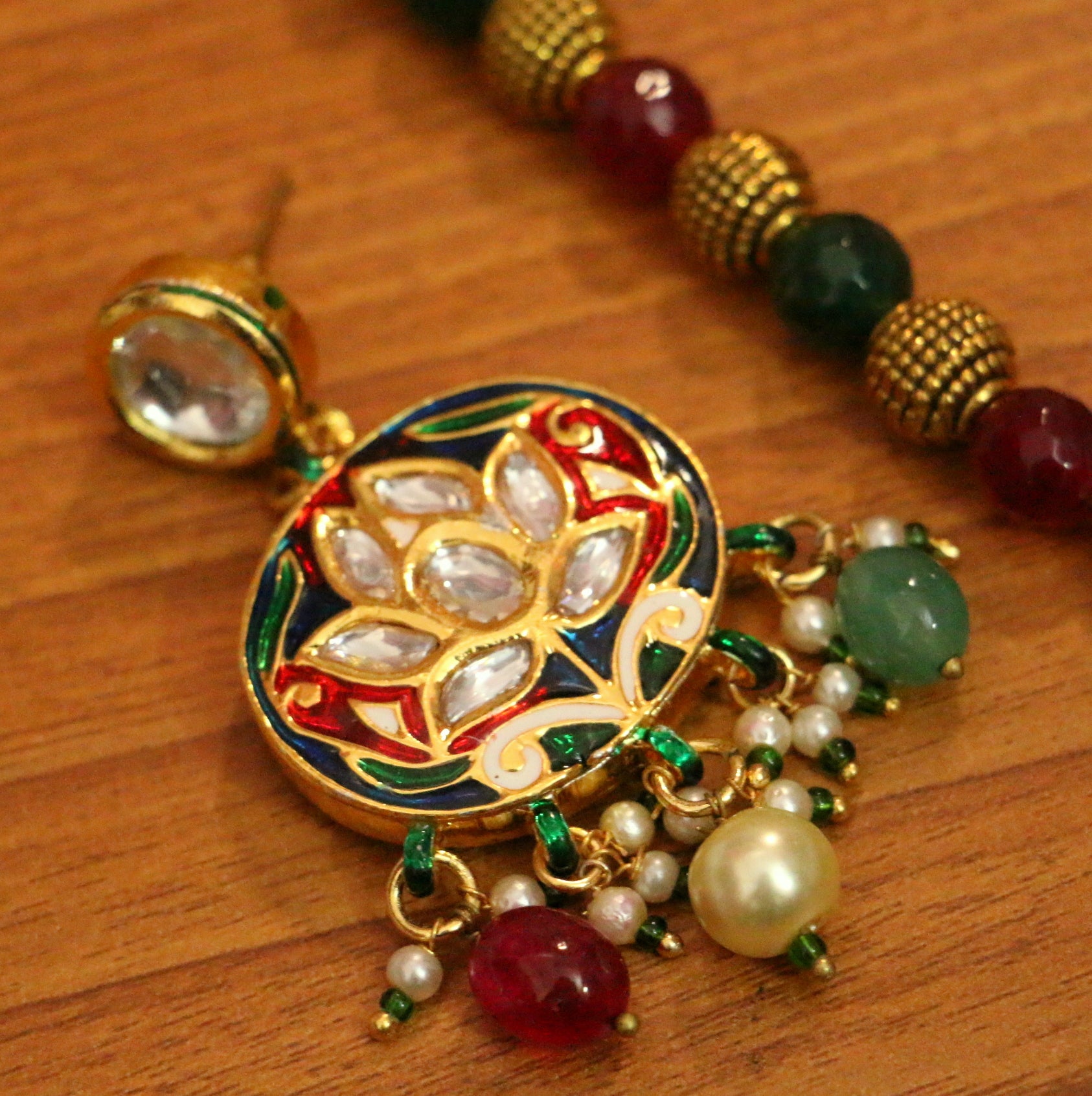 This multicolour kundan polki necklace set Is handcrafted in silver alloy with imitation kundan polki stone and semi precious bead & pearl. the necklace set is coated with 18kt gold plating and nickle free plating to avoid allergy to the skin.