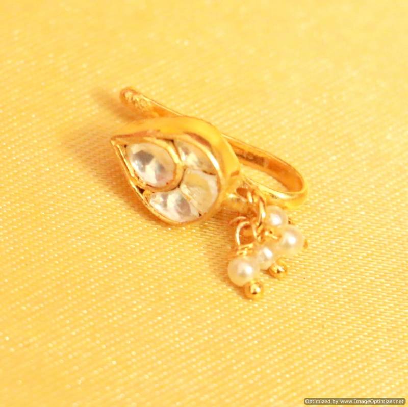 This kundan nose ring is handcrafted in silver alloy with imitation pearl and kundan polki stones of very fine quality . This nose ring is coated with fine gold rhodium plating which gives it a real look . The design itself is very unique and a perfect party wear.