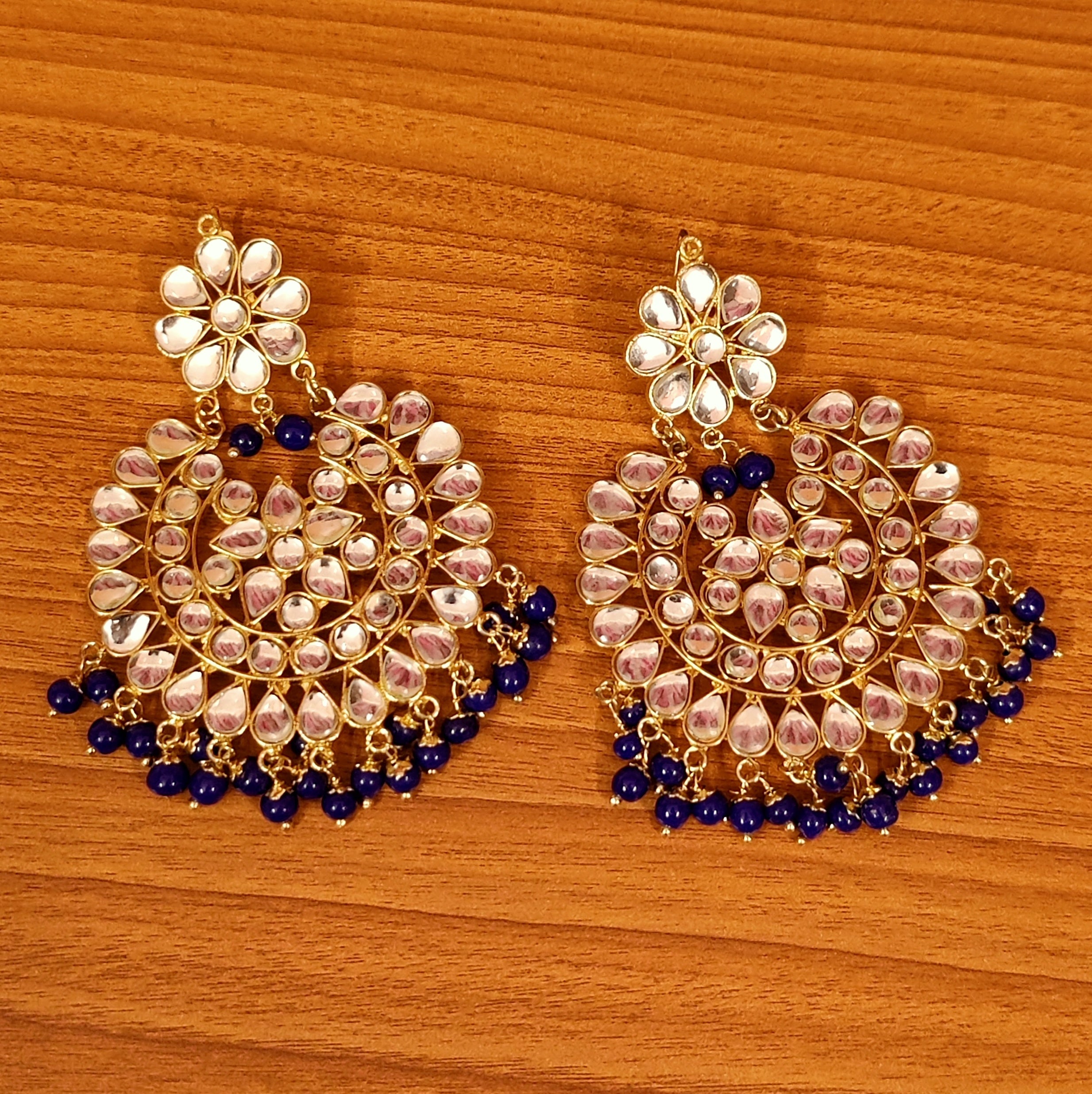 These kundan polki chandbali earrings are handcrafted in silver and brass alloy with imitation blue crystal & kundan polki stone of very fine quality. These party wear chandbali's are plated with real 18kt fine nickel free gold rhodium to avoid any allergies to the skin. These earrings are very light weighed and can be worn with ethnic dresses.