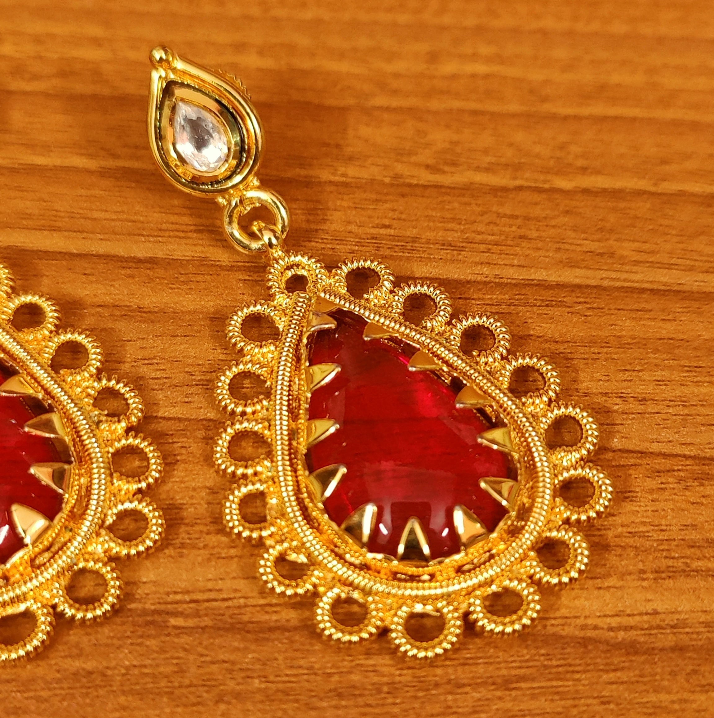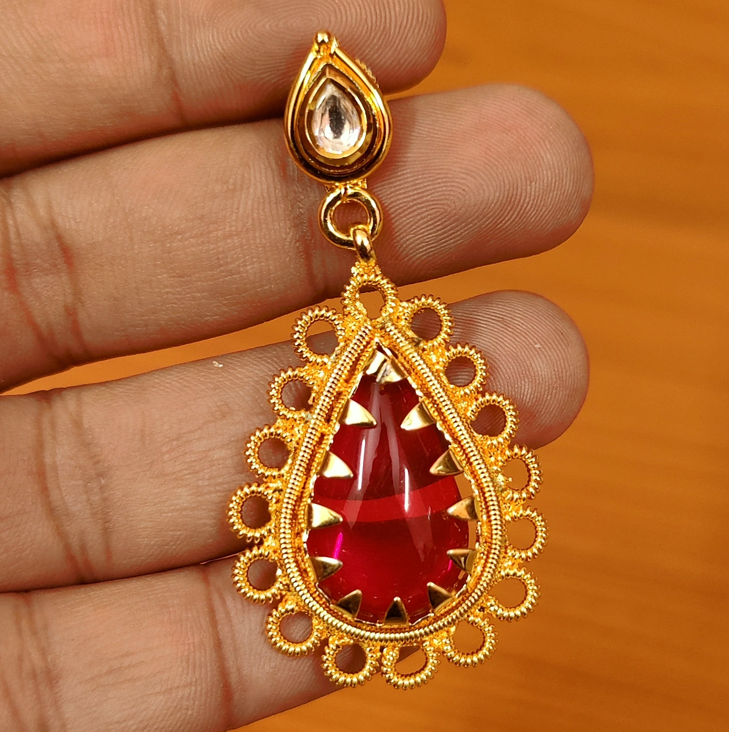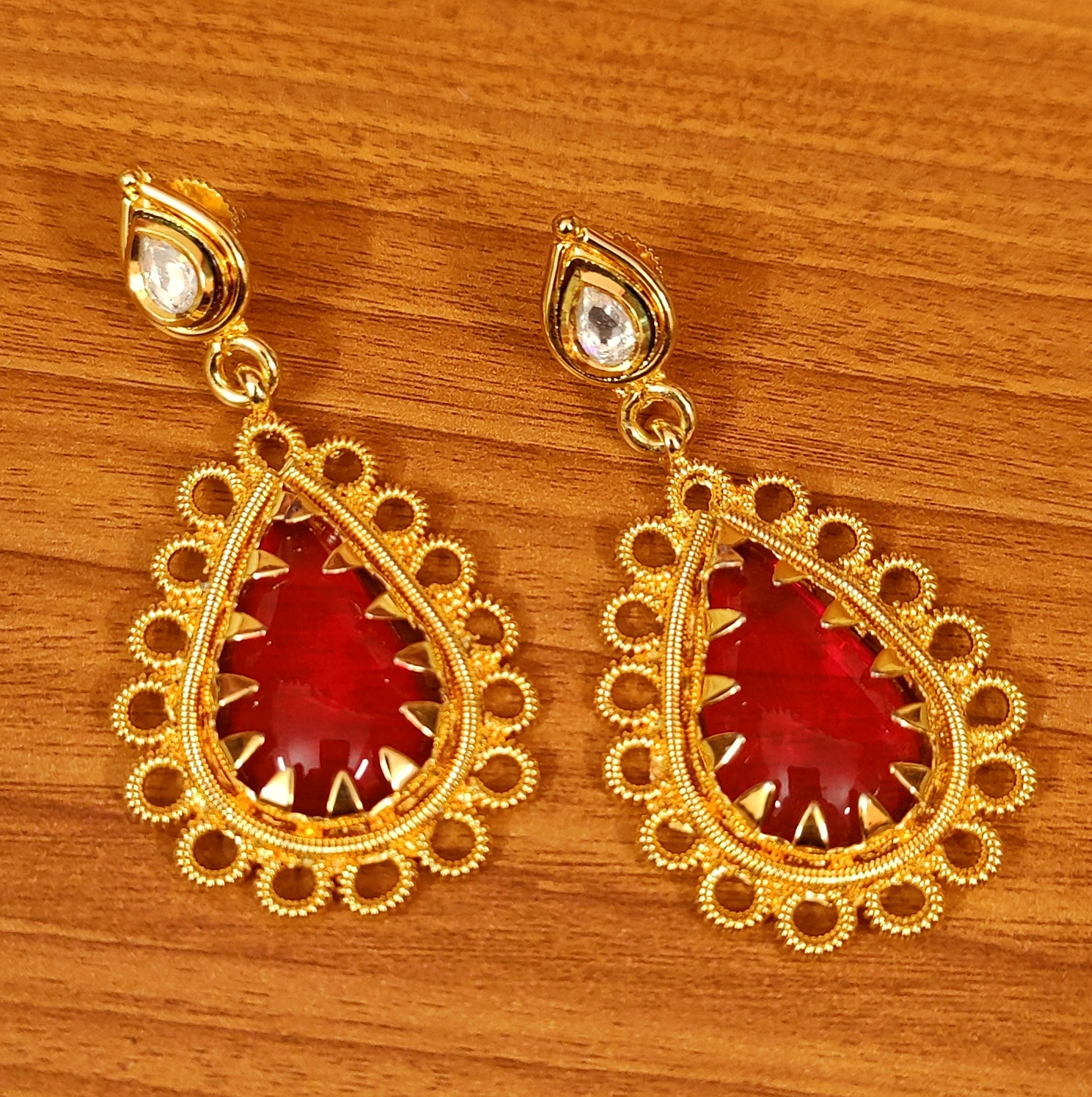 These gold look earrings are handcrafted in copper alloy with imitation pink colour stone & pear shaped kundan polki stones of very fine quality. These simple party wear earrings are plated with 18kt fine nickel free gold rhodium that gives a real look to the design, the earrings are very light in weight.