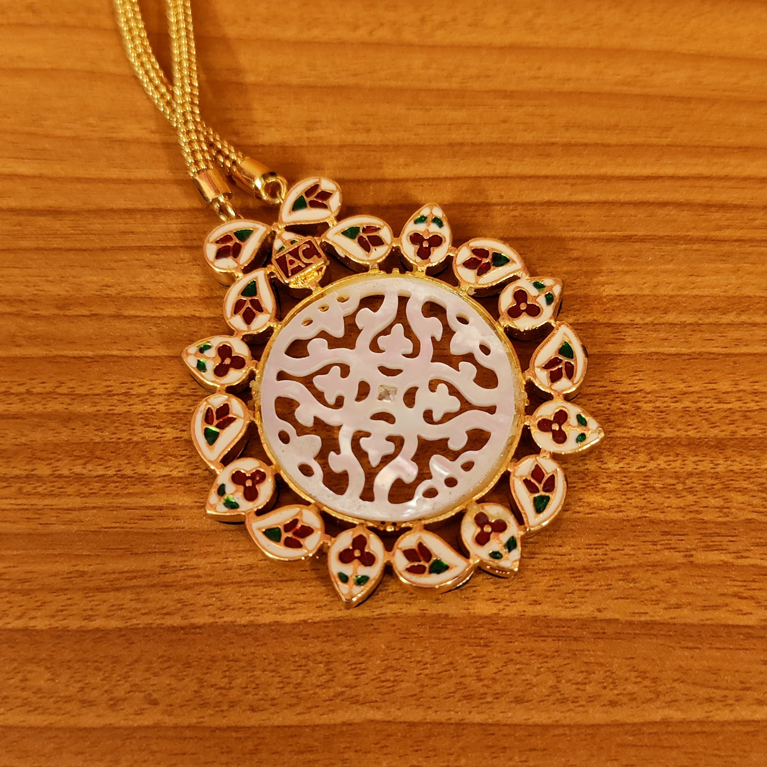 This handcrafted beautiful pendant set Is made in silver alloy with imitation mother of pearls & kundan polki stone of extremely fine quality. This gorgeous pendant set is handcrafted with fine engravings done with hand and is plated 18kt nickle free gold rhodium that gives the design a real look . the pendant comes with a matching pair of earrings which are absolutely gorgeous and are very light in weight.