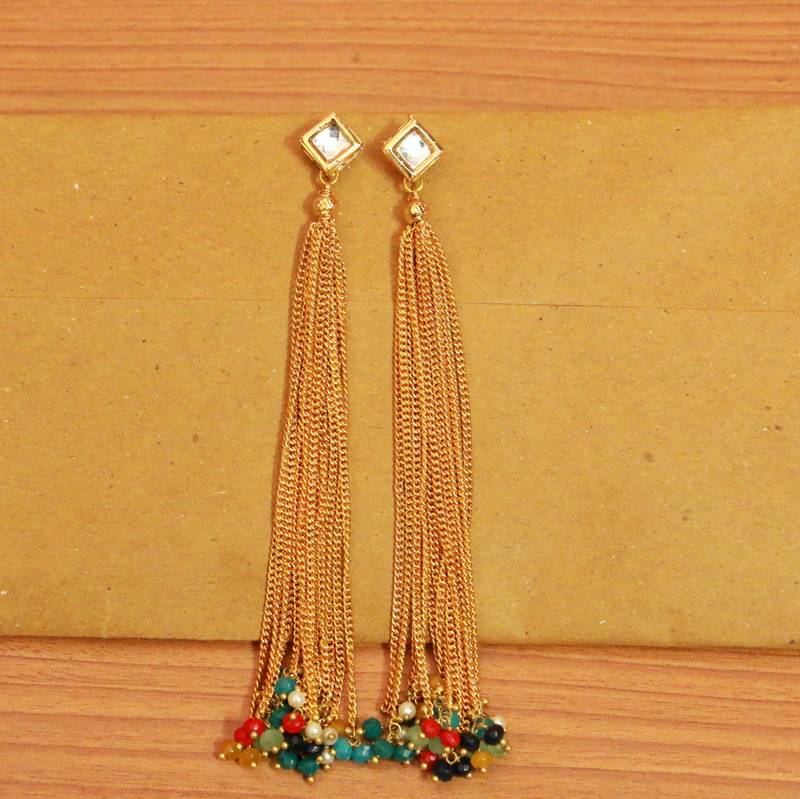 This earrings is handcrafted in silver alloy with imitation multi swarovski crystal & kundan with meenakari work of very fine quality , this earrings is coated with 18kt nickle free gold plating to avoid skin allergies and its very light in weight .