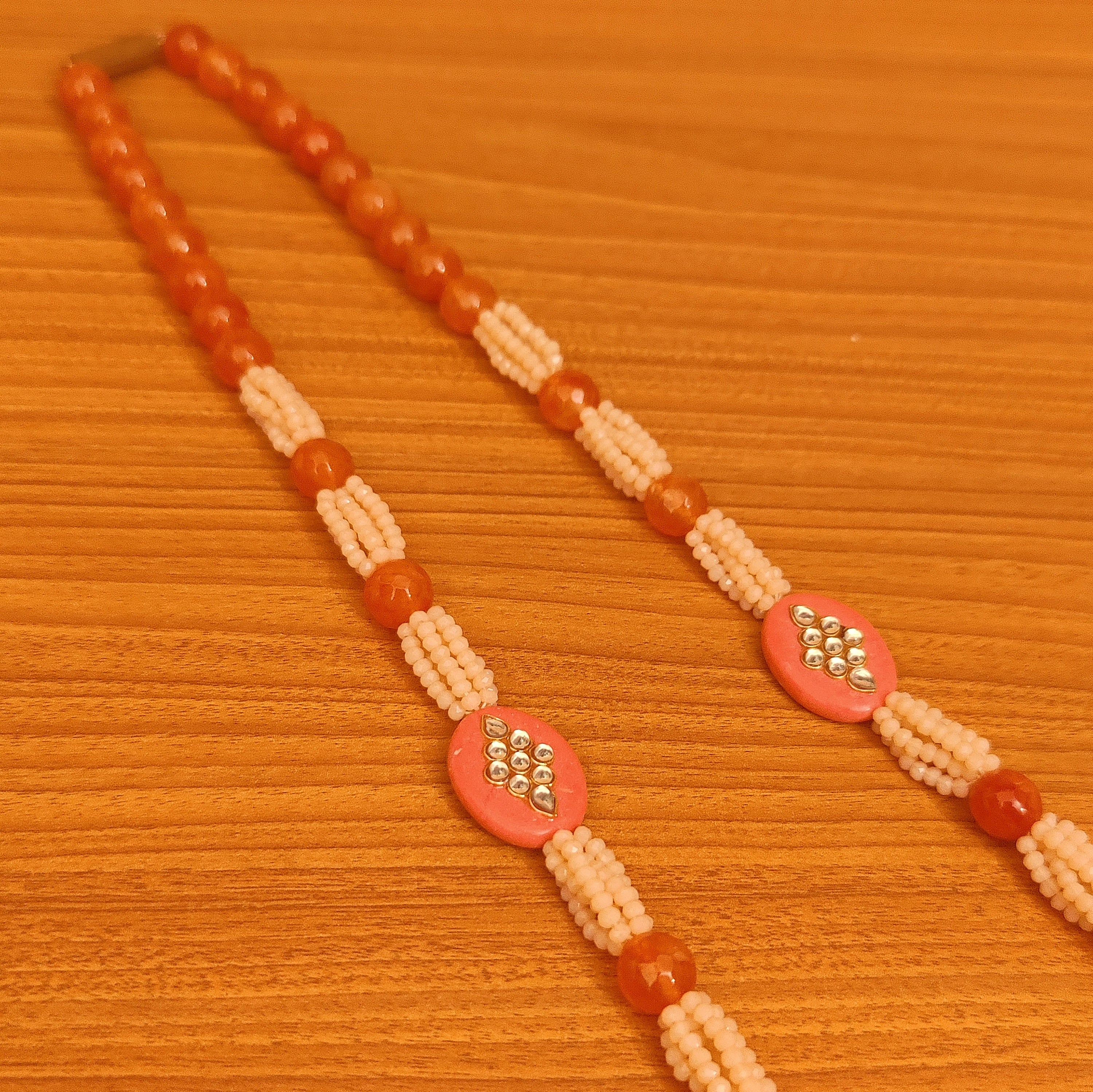 This necklace is handcrafted in copper alloy with crystal beads and semi precious orange quartz . The necklace is very light in weight and is plated with 18kt gold plating.
