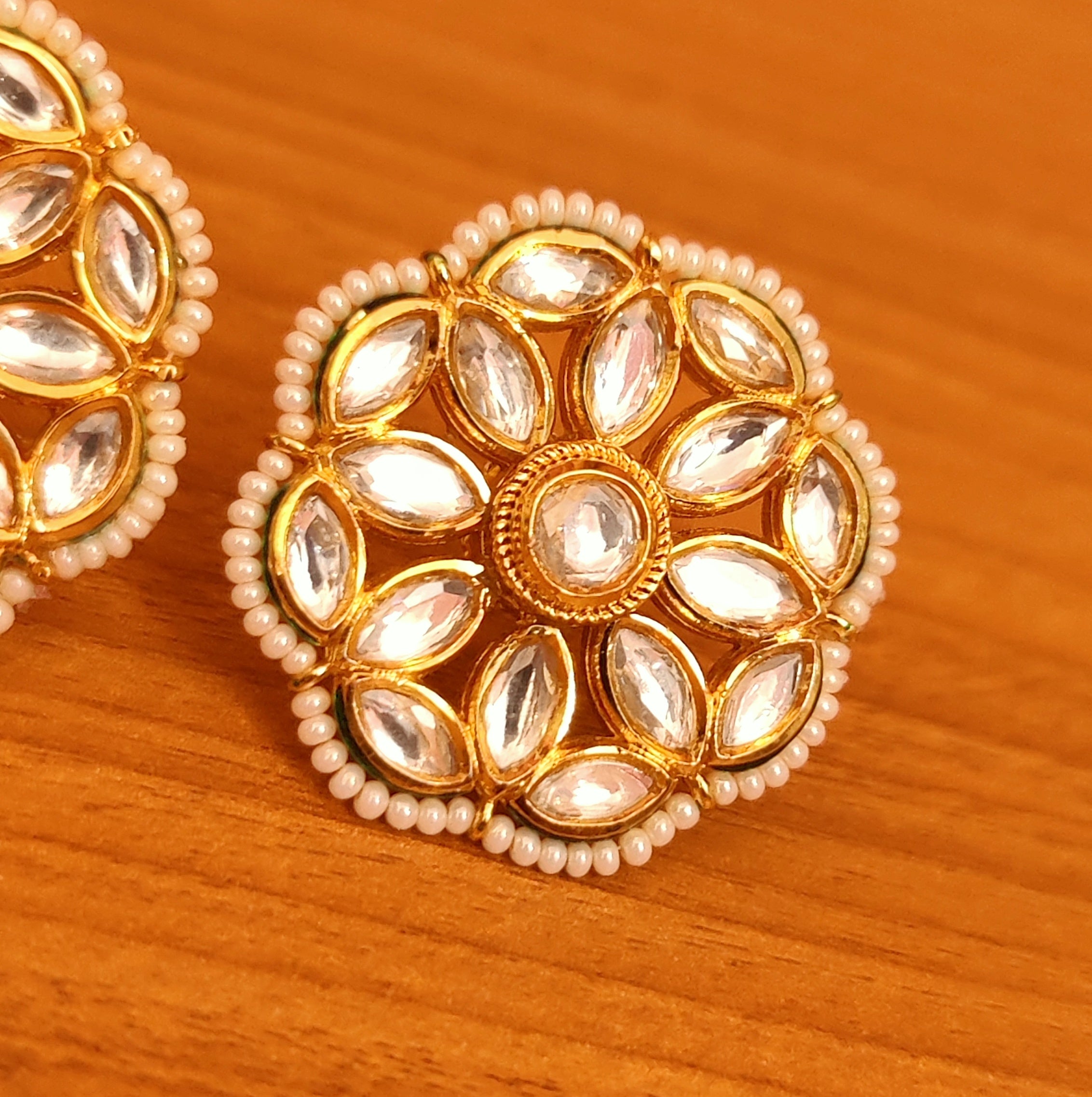 These beautiful kundan polki studs are handcrafted in brass alloy with imitation cz stone & kundan work of very fine quality. these artistic yet modern earrings are plated with high quality gold rhodium. the earrings are very light in weight.