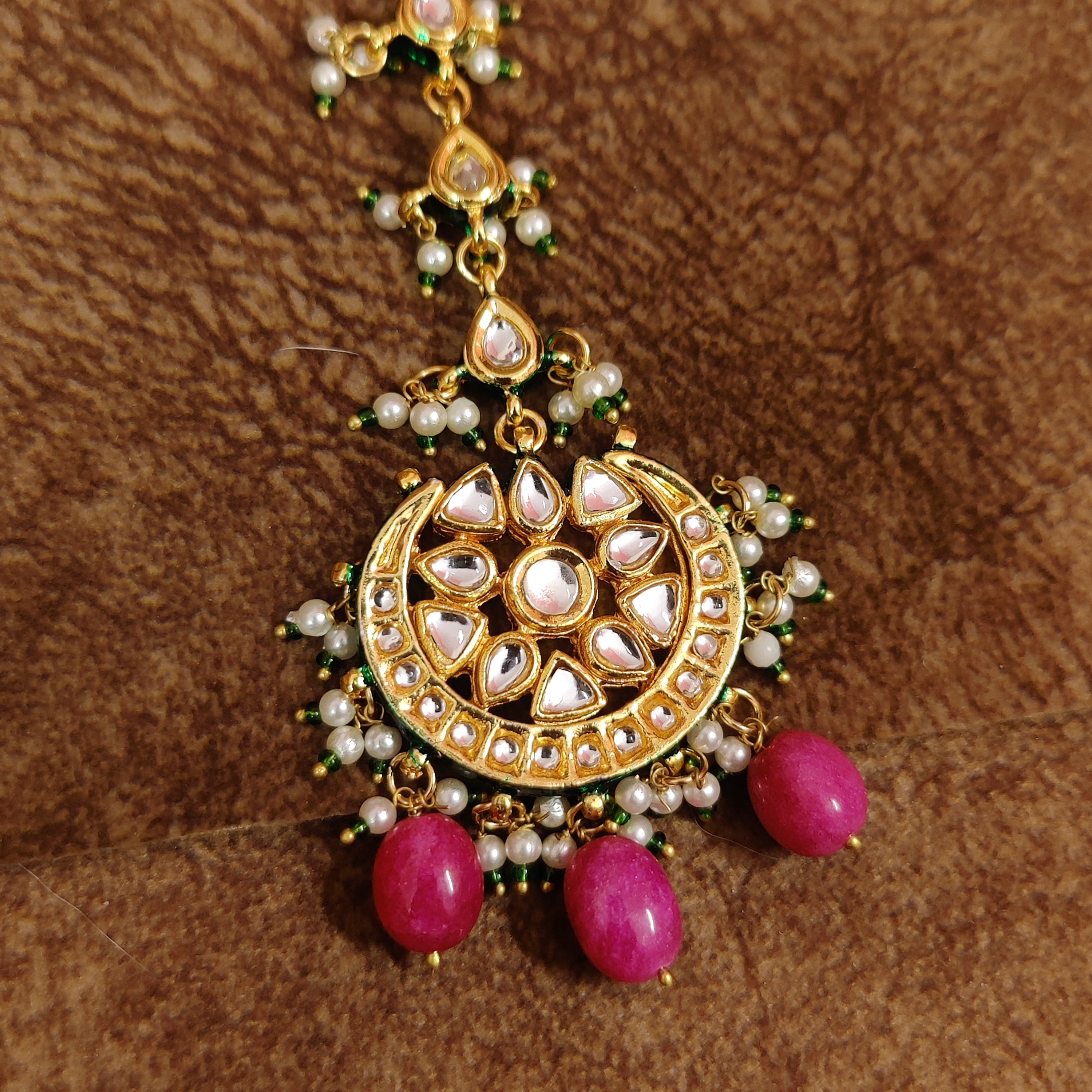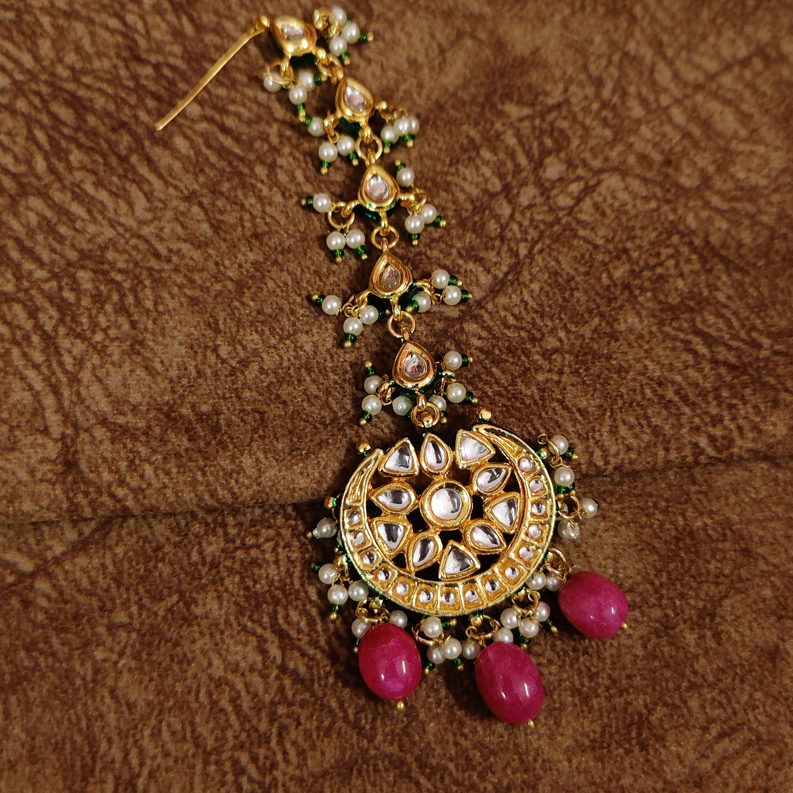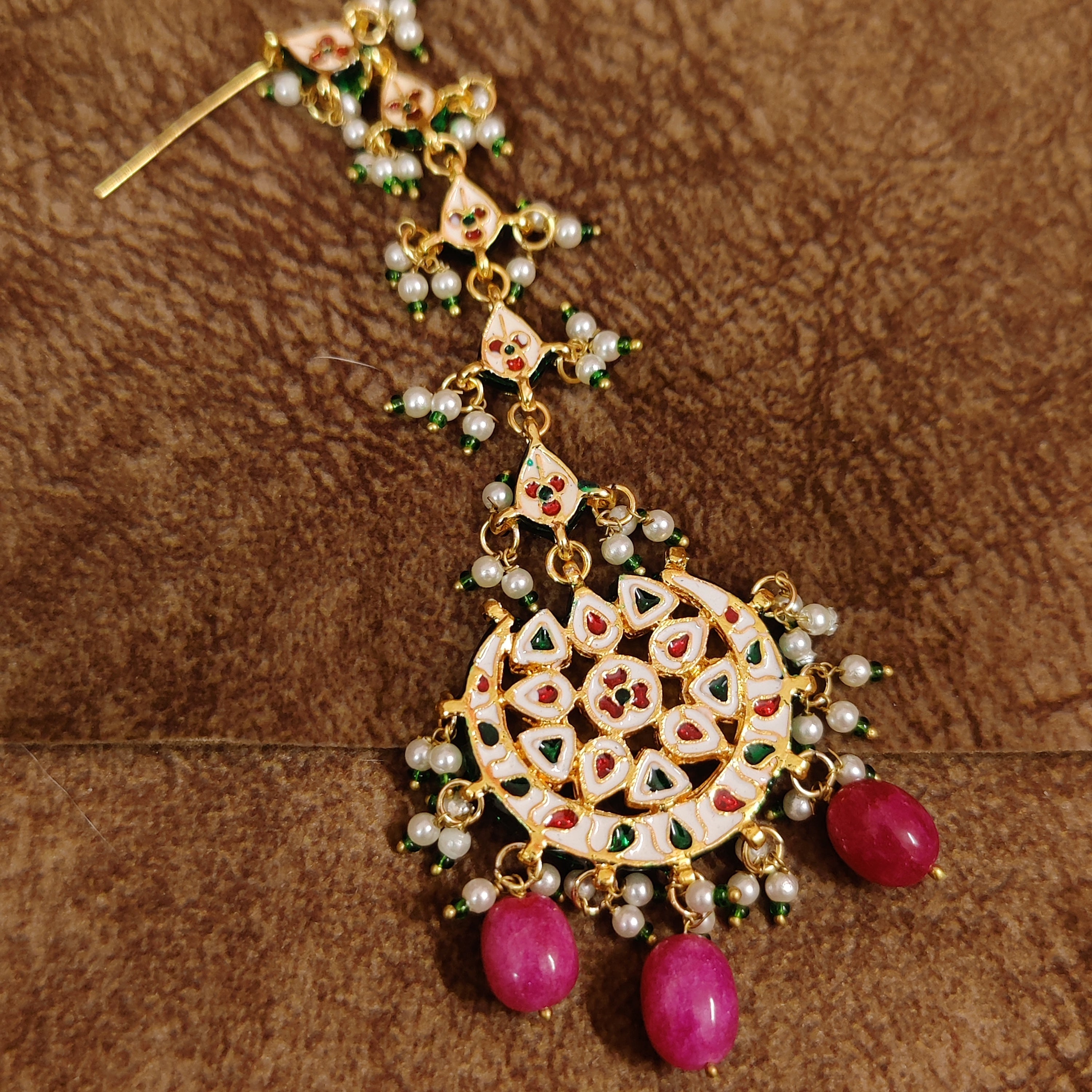 This stunning silver & brass alloy maangtikka features imitation pinkish red beads and semi precious pearls, adorned with intricate hand meenakari and kundan polki work. Handcrafted to perfection, this maangtikka boasts of top-notch quality and is plated with 18kt nickel-free gold rhodium for a dazzling, wedding-ready look.