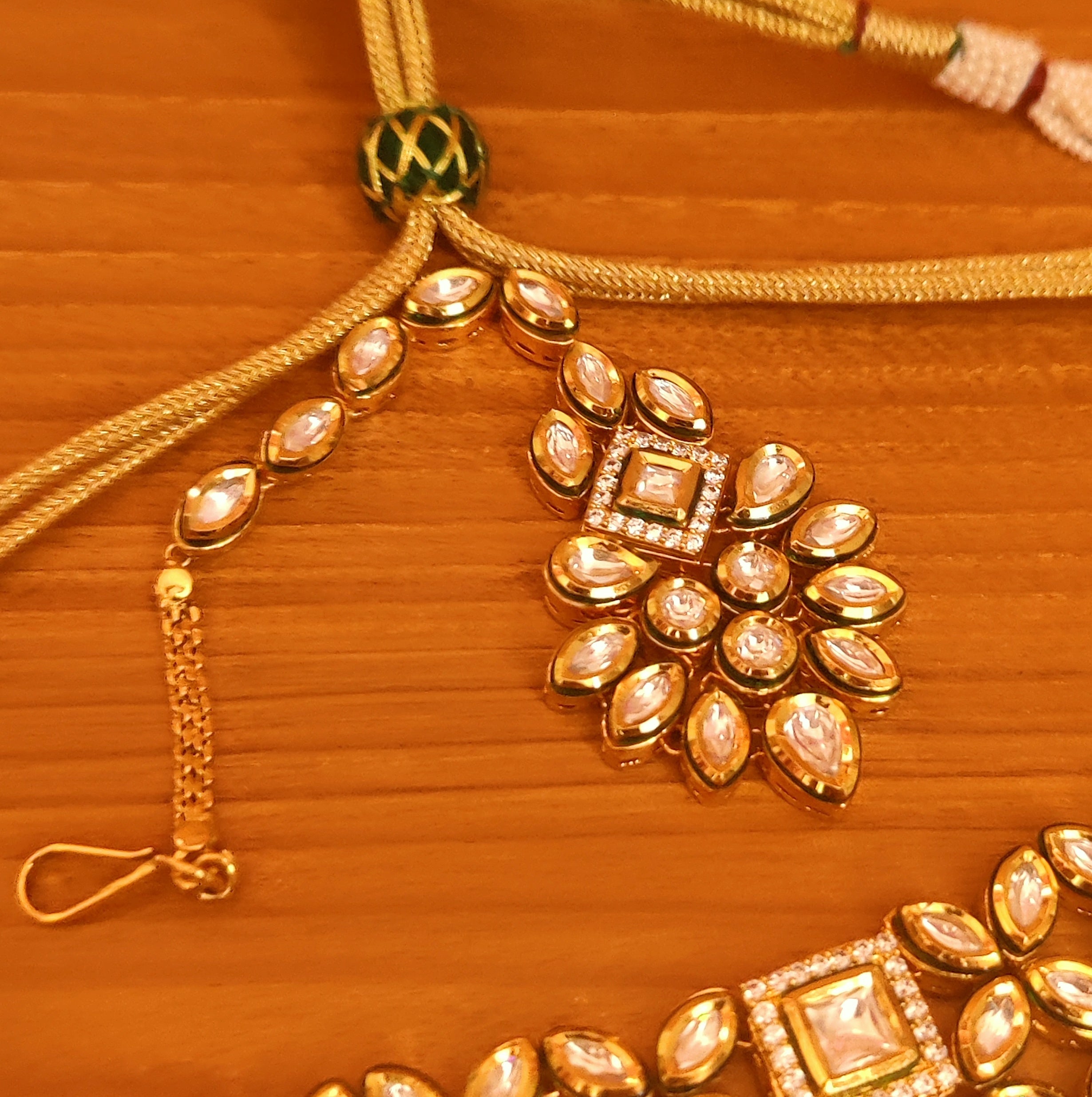 This beautiful necklace set is handcrafted in brass alloy with imitation cz stone & kundan with meenakari work of very fine quality . this necklace set is coated with 18 Kt gold polish which give them a unique look . an absolutely stunning piece to own and are very light in weight.