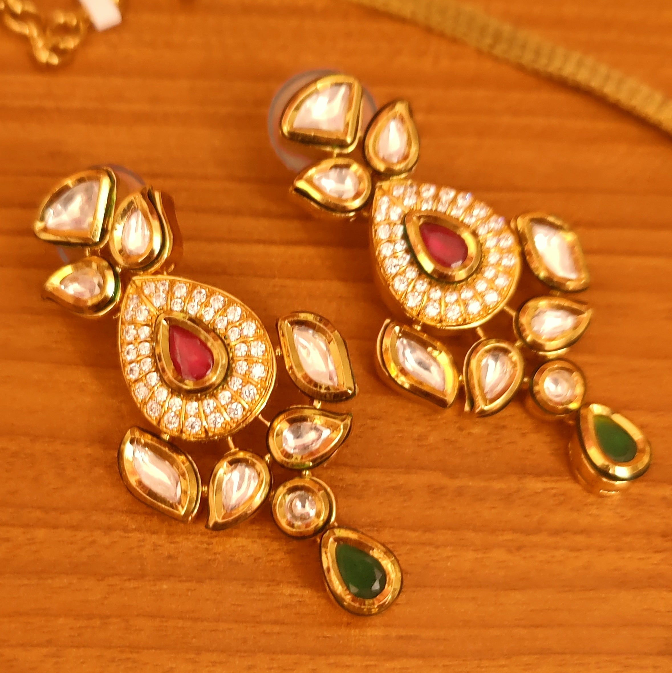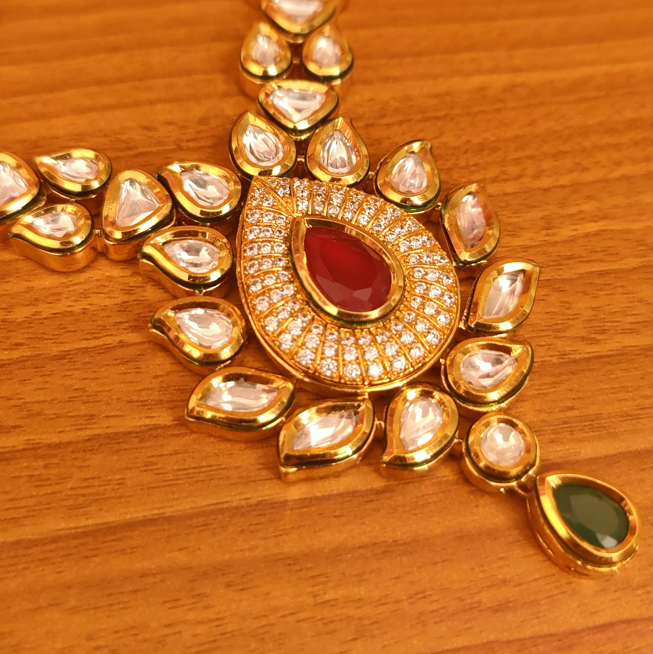 This beautiful necklace set is handcrafted in brass alloy with imitation red & green colour stone and cz stone, kundan work of very fine quality . this necklace set is coated with 18 kt gold polish which give them a unique look . an absolutely stunning piece to own and are very light in weight.