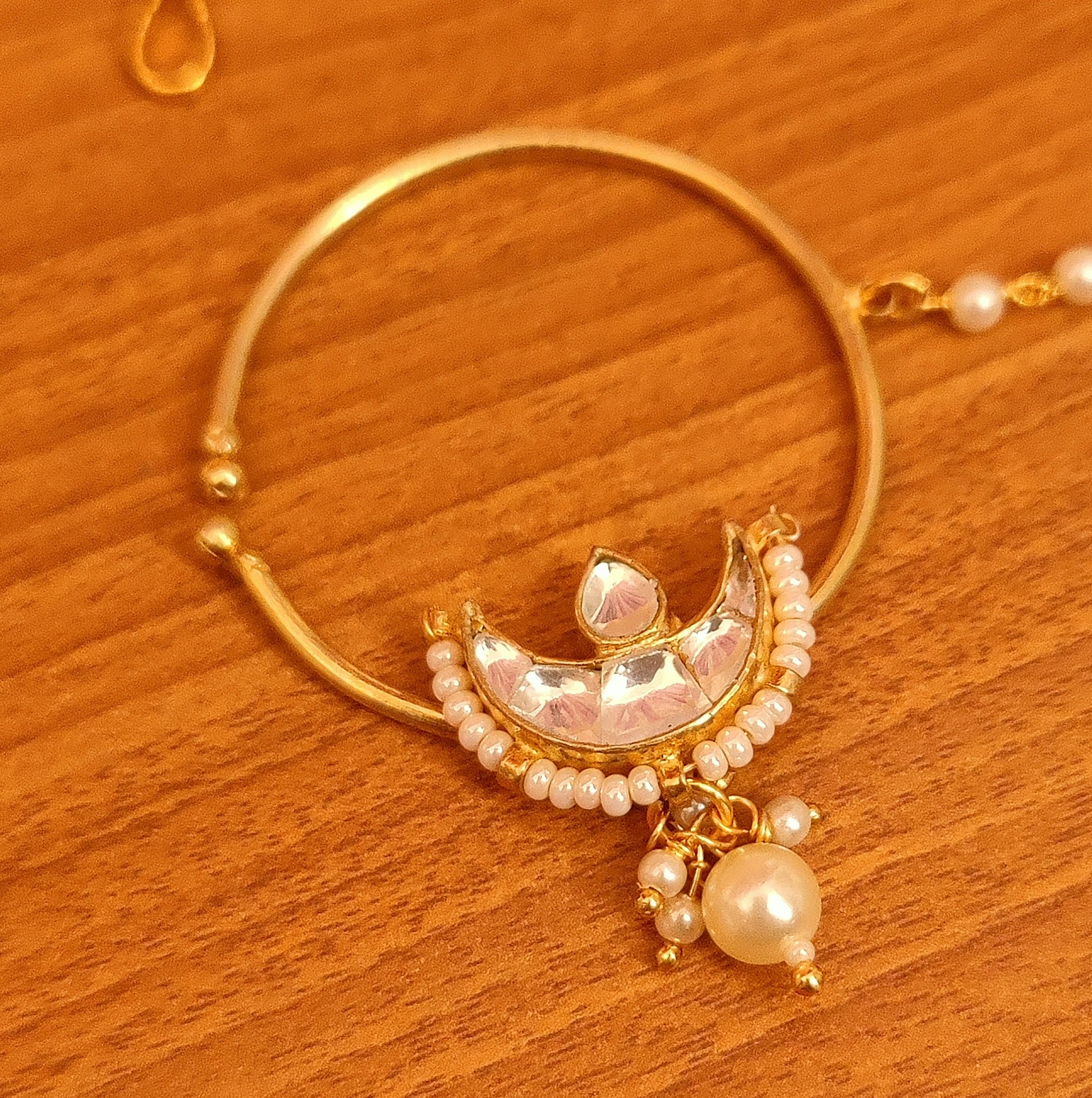 KUNDAN & PEARL GOLD PLATED MARATHI BRIDAL NOSE RING