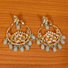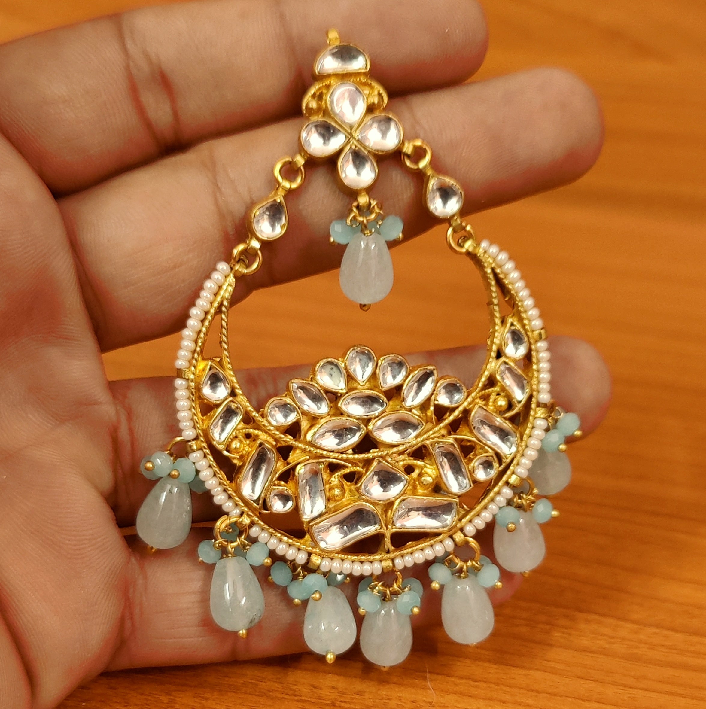 These kundan polki earrings are handcrafted in silver alloy with imitation sky blue colour onyx stones and kundan polki uncut stones of very fine quality. These party wear earrings are plated with 18kt antique gold plating which gives the design a real gold look , the earrings are very light in weight and are perfect for occasional wear.