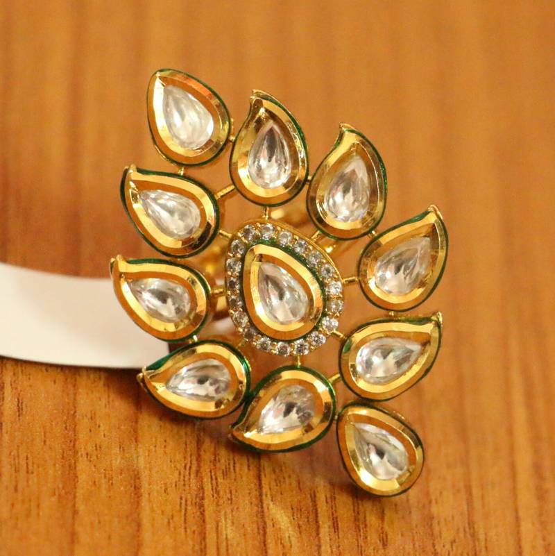 This beautiful ring is handcrafted in brass alloy with imitation kundan with meenakari work of very fine quality . This ring is coated with 18 kt gold polish which give them a unique look . An absolutely stunning piece to own and are very light in weight.