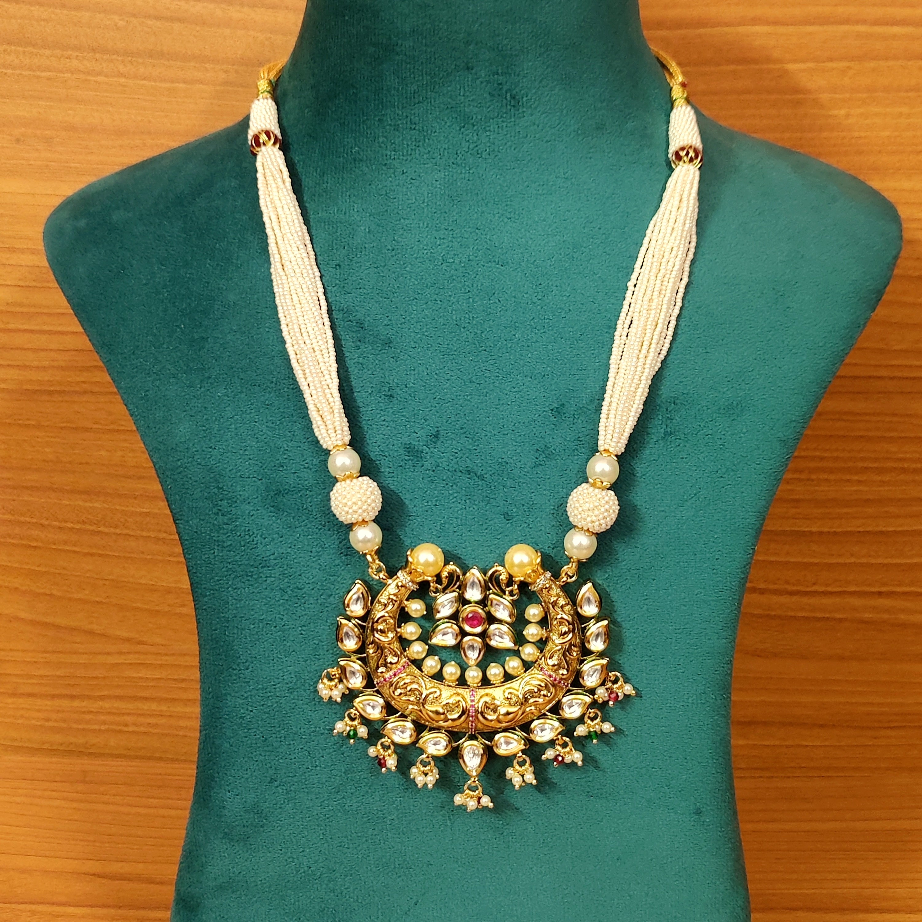 This handcrafted beautiful kundan pendant set Is made in silver alloy with imitation semi precious multicolour beads & pearls and kundan polki stones of extremely fine quality. This gorgeous pendant set is handcrafted with fine engravings done with hand and is plated with antique 18kt nickle free gold rhodium that gives the design a real gold look . the pendant comes with a matching pair of earrings which are absolutely gorgeous and are very light in weight.