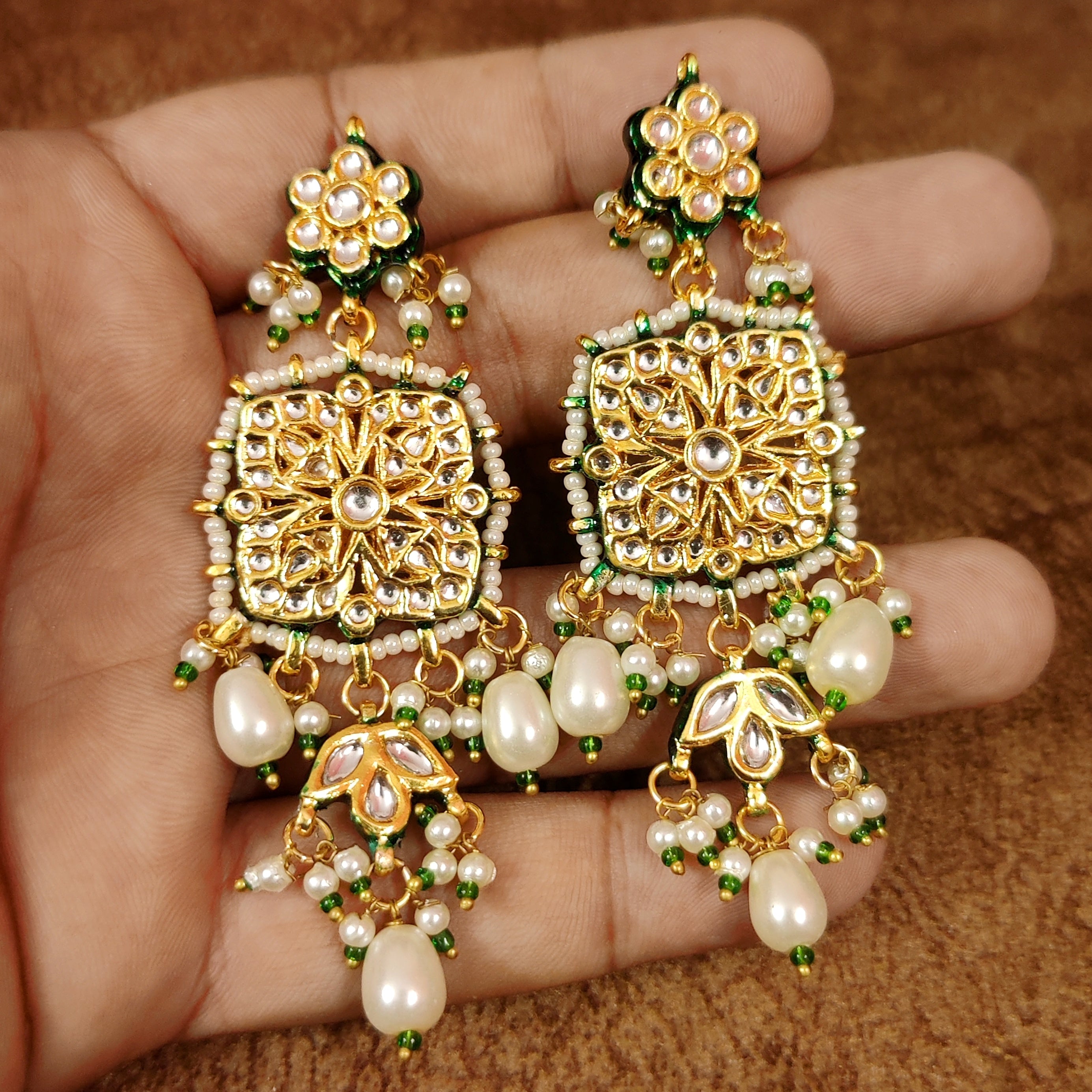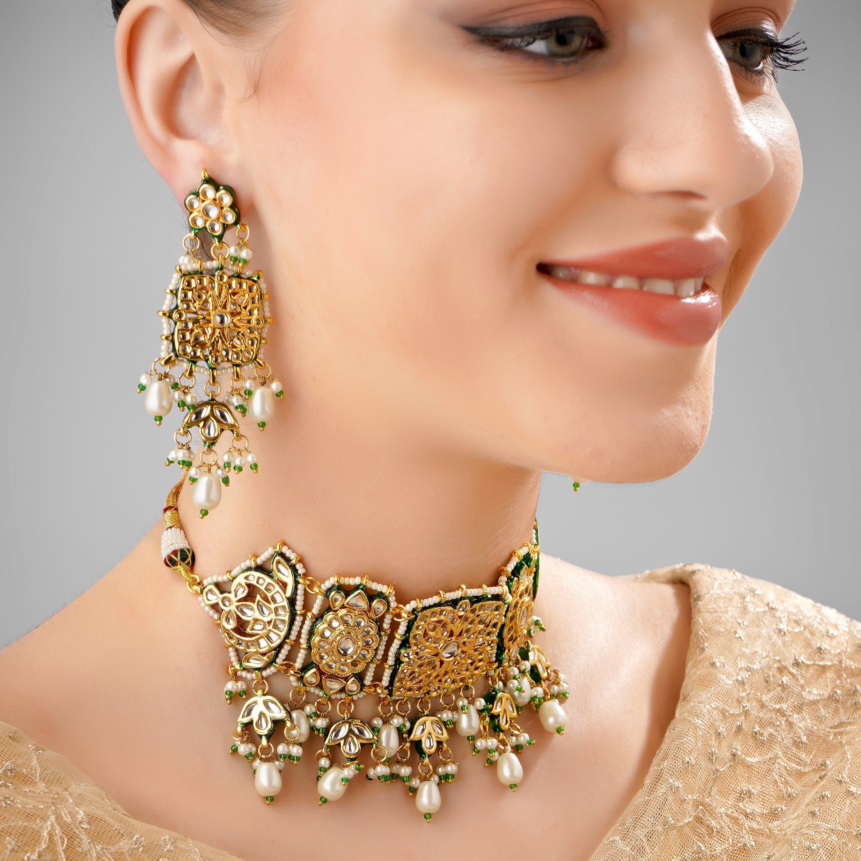 Adorn yourself with the elegance of the Kundan Polki Meenakari Pearl Choker Set from Sanvi Jewels. This exquisite set features intricate Kundan Polki craftsmanship, vibrant Meenakari enamel detailing, and delicate pearls for a regal finish. Perfect for weddings, festivals, and grand occasions, this choker set blends tradition with luxury, making it a timeless piece for special moments.
