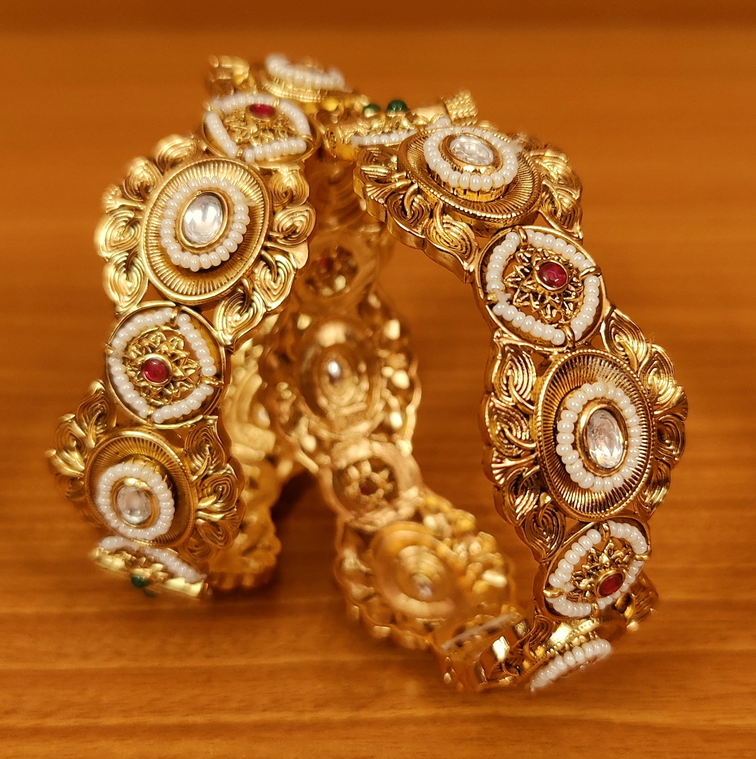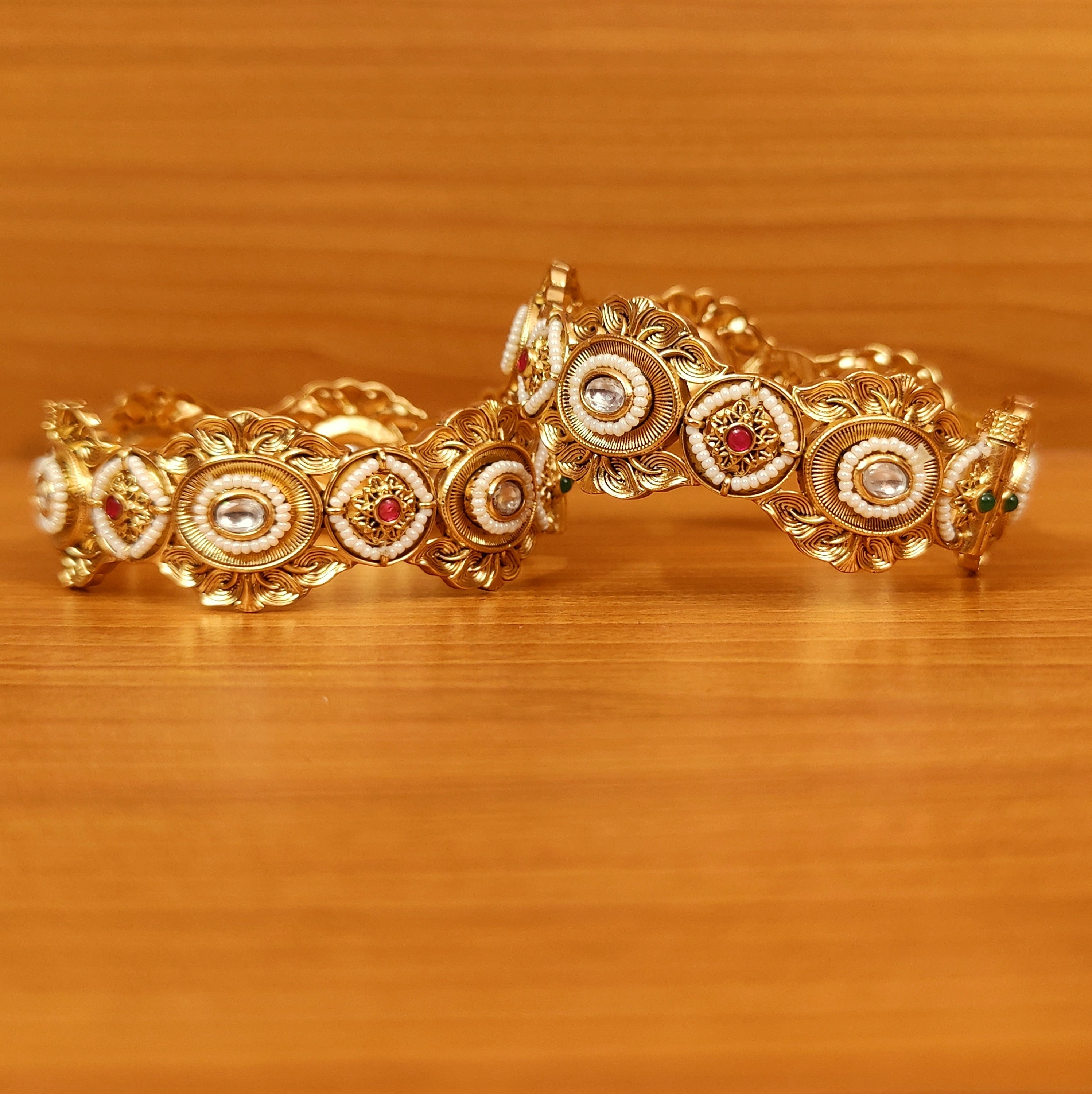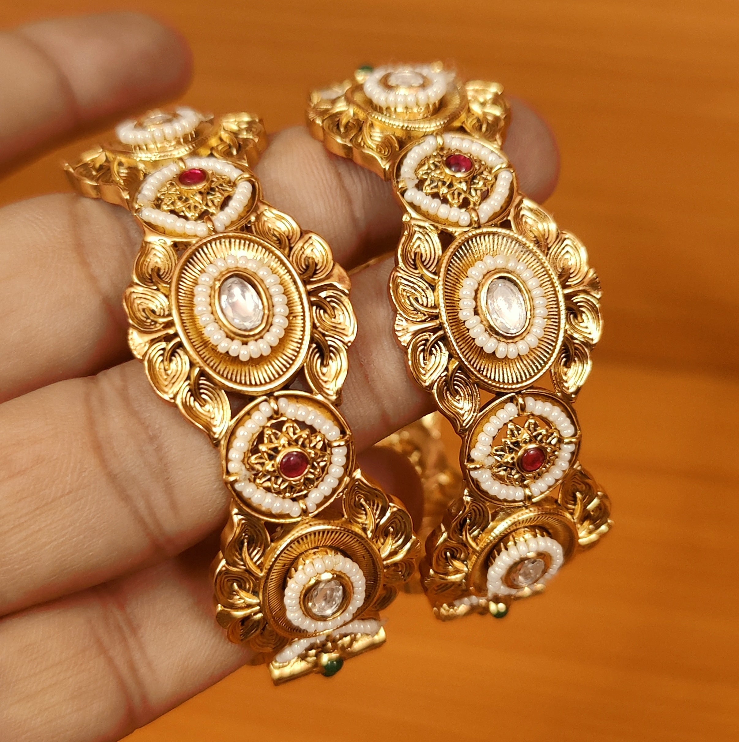 These beautiful gold plated bangles are handcrafted in copper alloy with imitation ruby colour stones, polki stones & pearls of very fine quality. These bangles are coated with 18 kt rajwadi gold plating that gives a real look to the design, these bangles comes in a pair of two and are perfect for party wear. These bangles are are openable which means if you are selecting 2.4 size, it can fit both 2.4 size and 2.6 size.