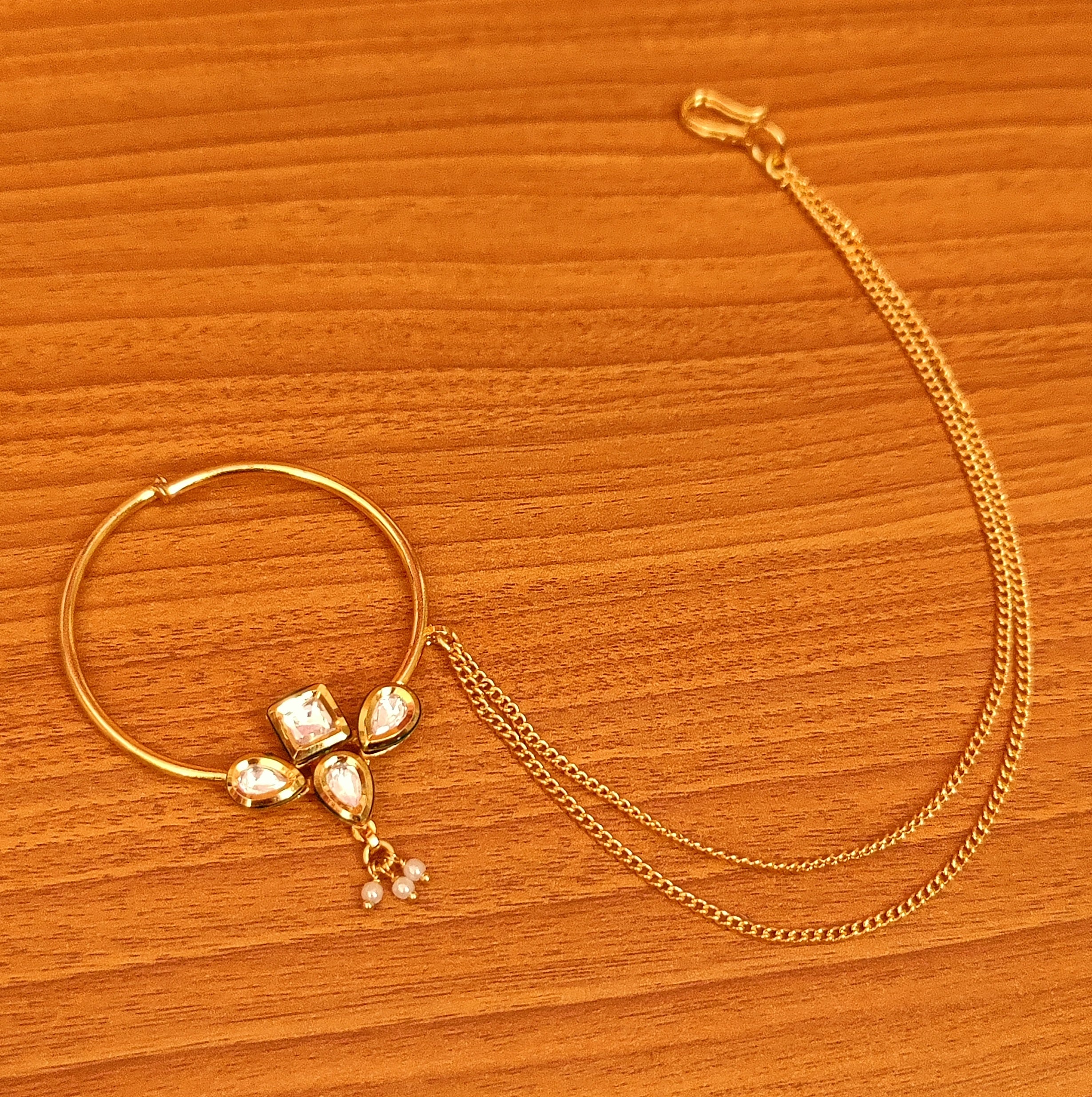 This beautiful nose ring is handcrafted in brass alloy with imitation kundan with meenakari work of very fine quality . this nose ring is coated with 18 kt gold polish which give it a real look . an absolutely stunning piece to own and is very light in weight.