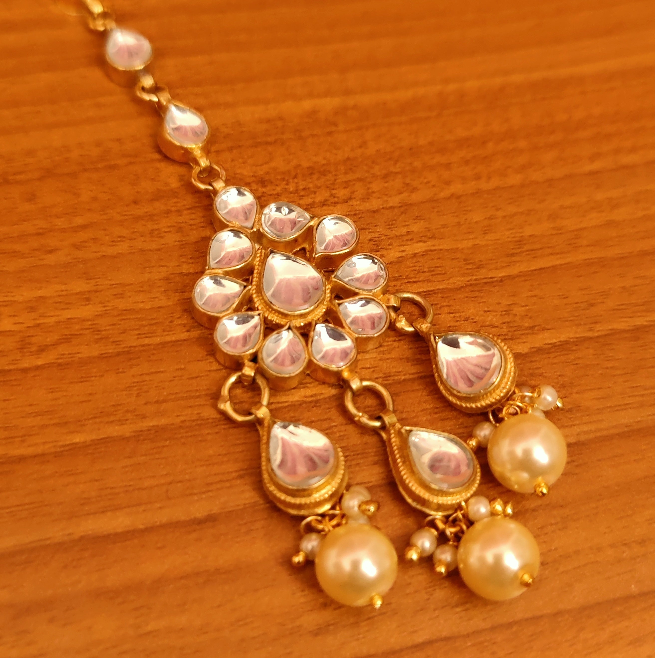 This kundan look maang tikka is handcrafted in silver alloy with imitation pearls & kundan polki stones of very fine quality . This maang tikka is coated with gold rhodium plating as done on the real jewellery . The design itself looks very real and is perfect for wedding wear.